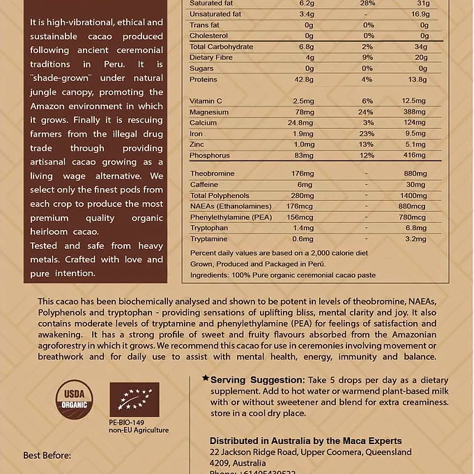 Seleno Health Organic Amaru Ceremonial Cacao Paste Drops is 100% pure, single-origin, raw Criollo cacao directly from the farm in Peru. The easy and convenient way to get your ceremonial cacao. It is third party tested for heavy metals.