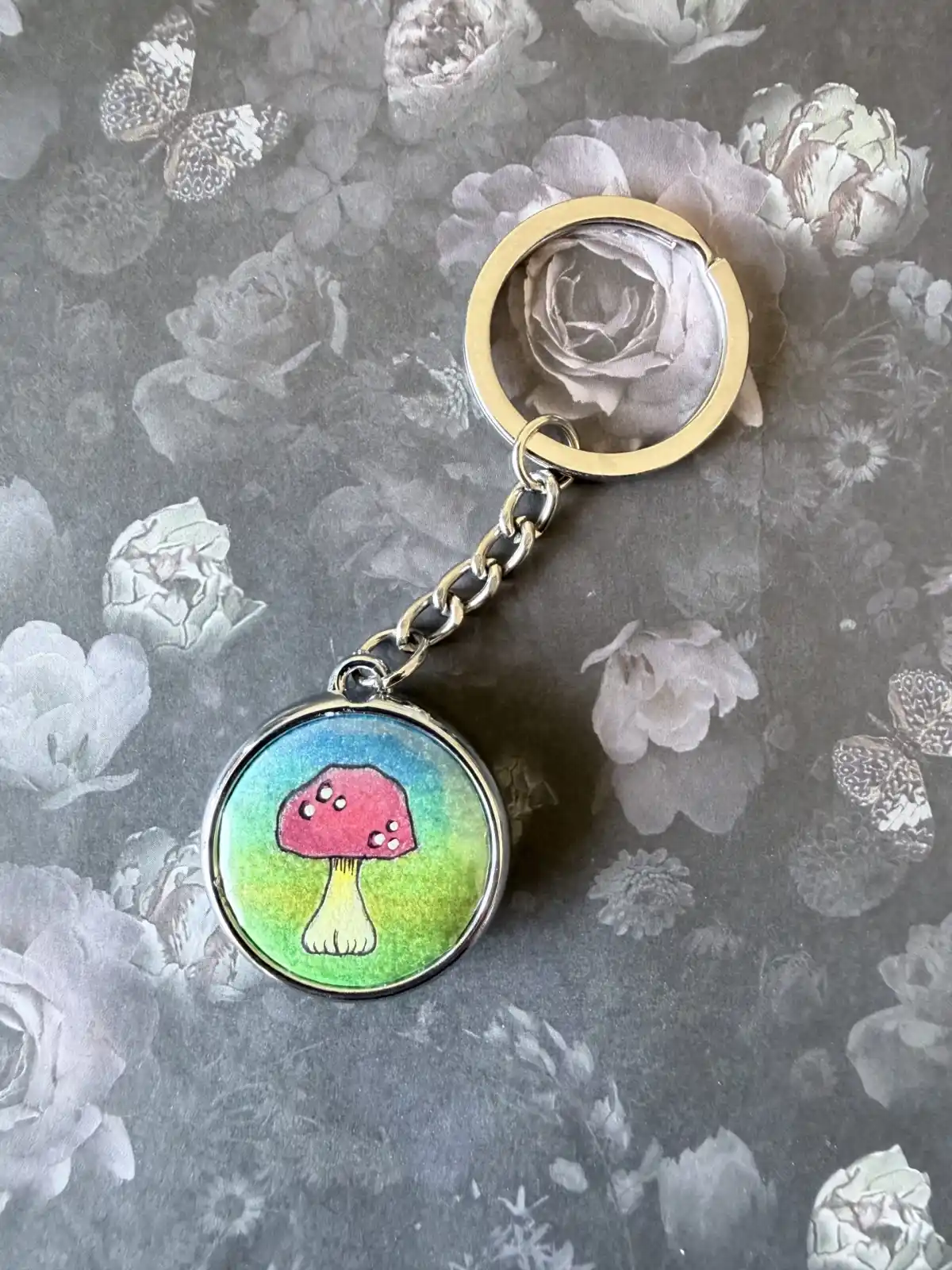 This keychain was hand drawn and hand assembled, and is the only one of its kind!