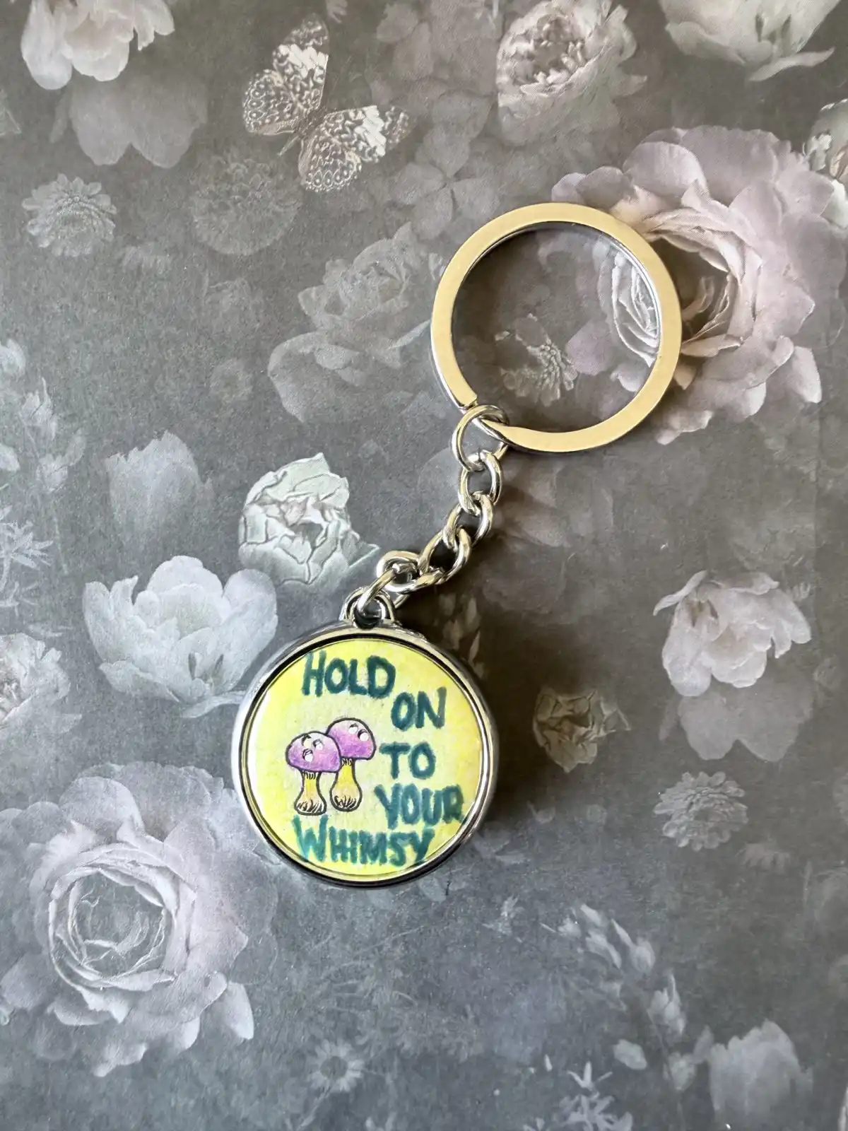 Hold on to your whimsy. We can be full of rage and still make room for whimsy, even in terrible times, but we have to hold on tight. This Shroomy keychain is part of the Rage+Whimsy Series (9/10). It is double sided. One side depicts a pink mushroom on a warm background while the other side has two teeny, pink mushrooms with the phrase “Hold on to your whimsy.”