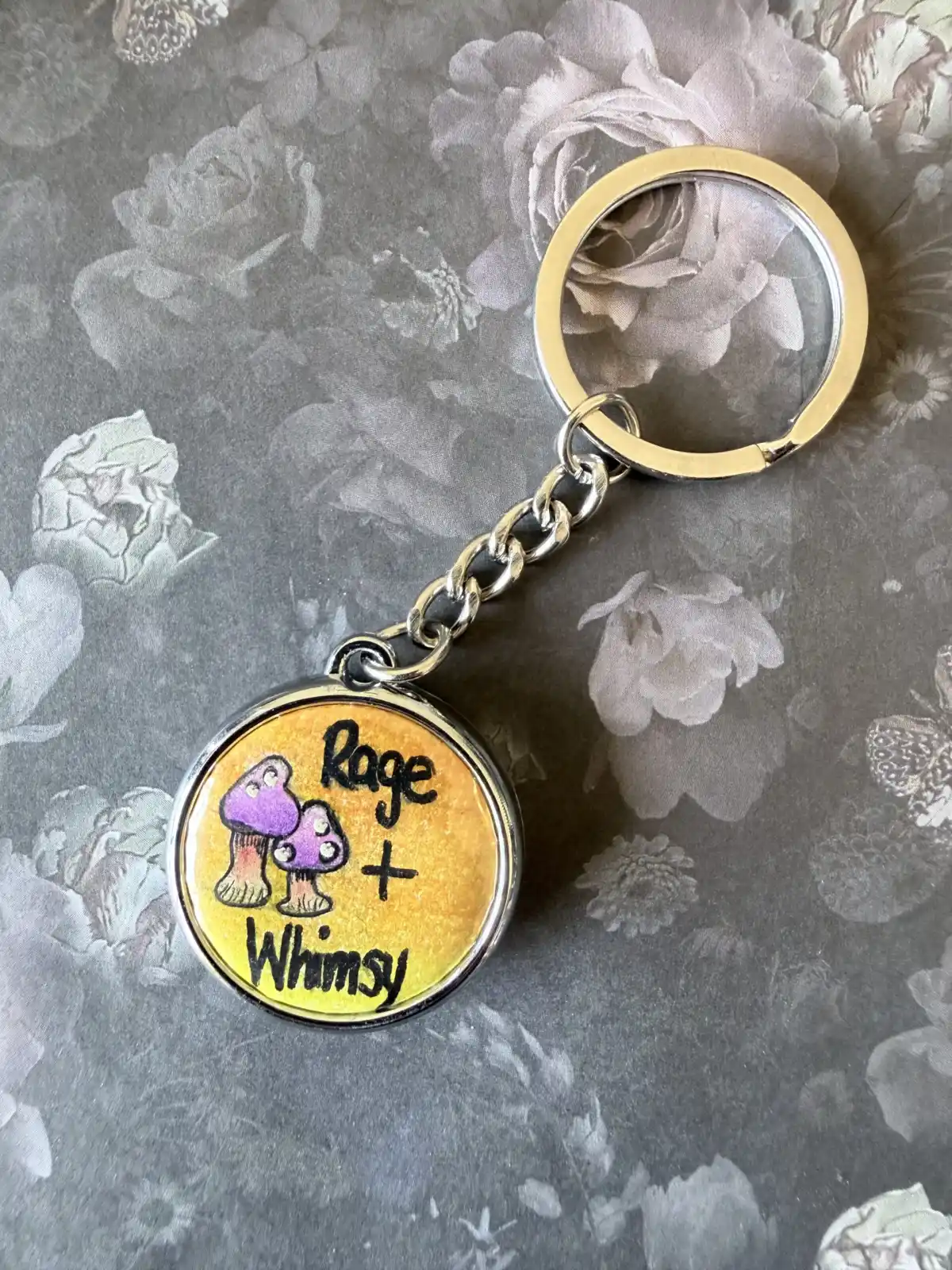 Rage+Whimsy. We can be full of rage and still make room for whimsy, even in terrible times. This Shroomy keychain is part of the Rage+Whimsy Series (4/10). It is double sided. One side depicts a small red mushroom on a green background while the other side has two teeny, purple mushrooms with the phrase “Rage + Whimsy”.