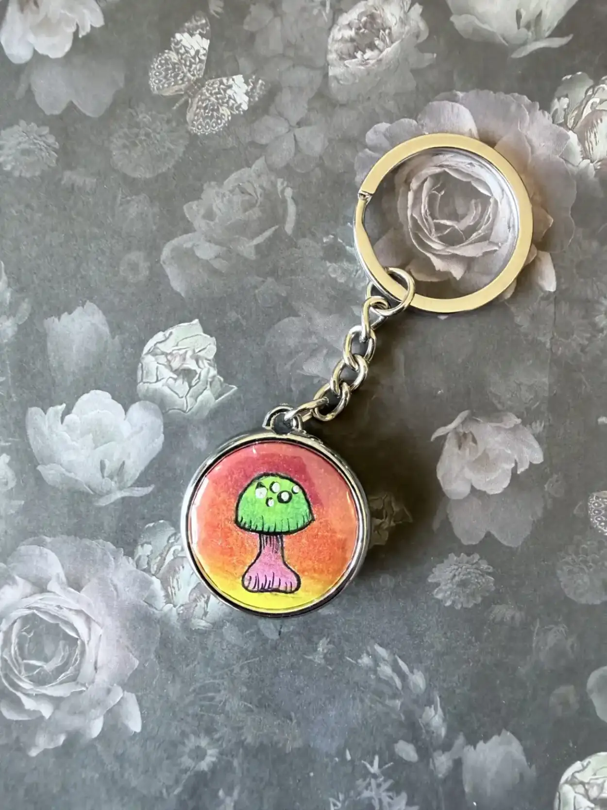 This keychain was hand drawn and hand assembled, and is the only one of its kind!