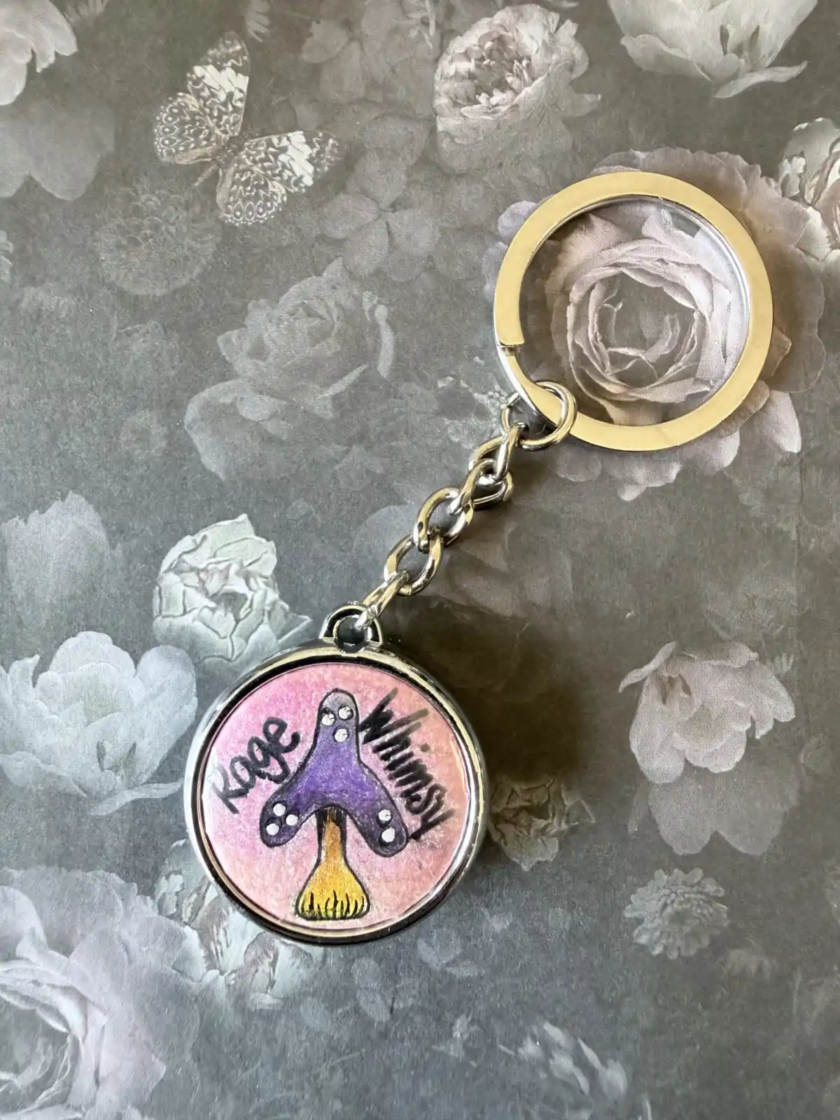Rage+Whimsy. We can be full of rage and still make room for whimsy, even in terrible times. This Shroomy keychain is part of the Rage+Whimsy Series (5/10). It is double sided. One side depicts 3 small blue mushrooms on an orange background while the other side has a purple mushroom with the phrase “Rage + Whimsy.”