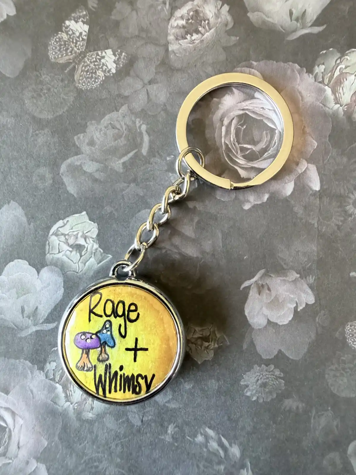 Rage+Whimsy. We can be full of rage and still make room for whimsy, even in terrible times. This Shroomy keychain is part of the Rage+Whimsy Series (2/10). It is double sided. One side depicts a small blue mushroom on a black background while the other side has two teeny mushrooms with the phrase “Rage + Whimsy).