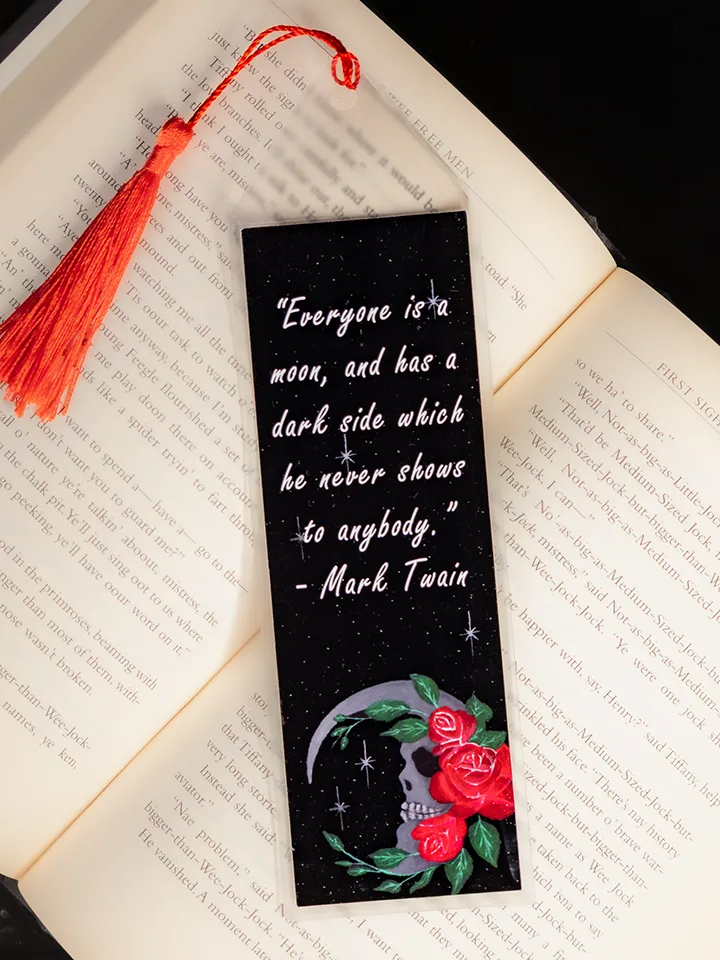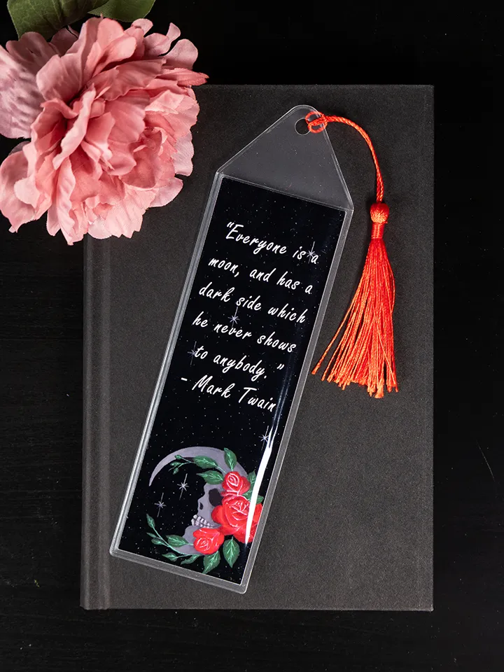 Bookmark with original skull moon painting. Bookmark has the quote “everyone is a moon, and has a dark side which he never shows to anybody.” by Mark Twain. Bookmarks come sleeved for protection with a colored tassel. Tassel color may vary but will match the bookmark as best as possible.