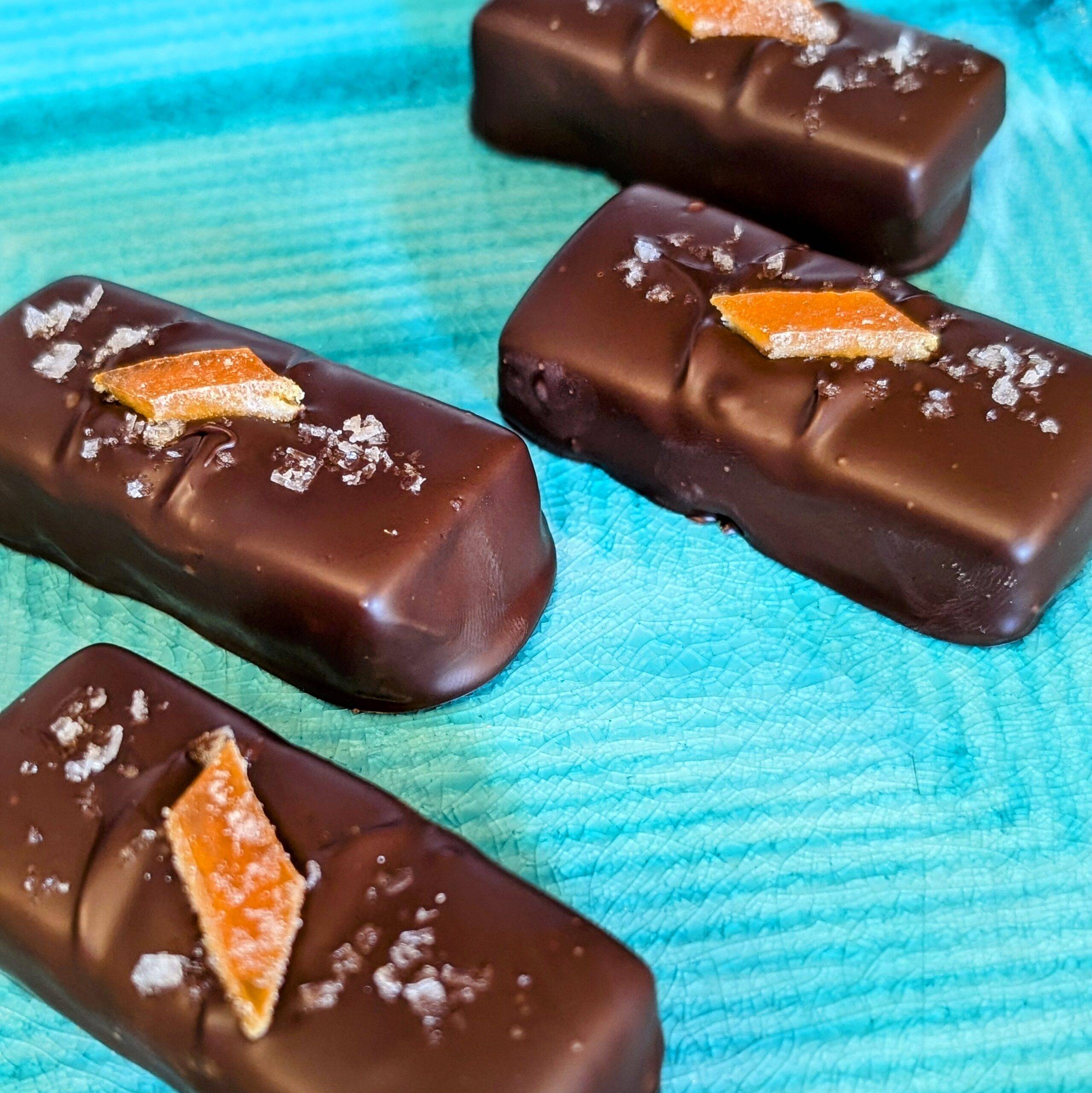 • Pistachio + Orange Caramel – bright citrus and nutty depth, topped with candied orange peel and flaked sea salt.