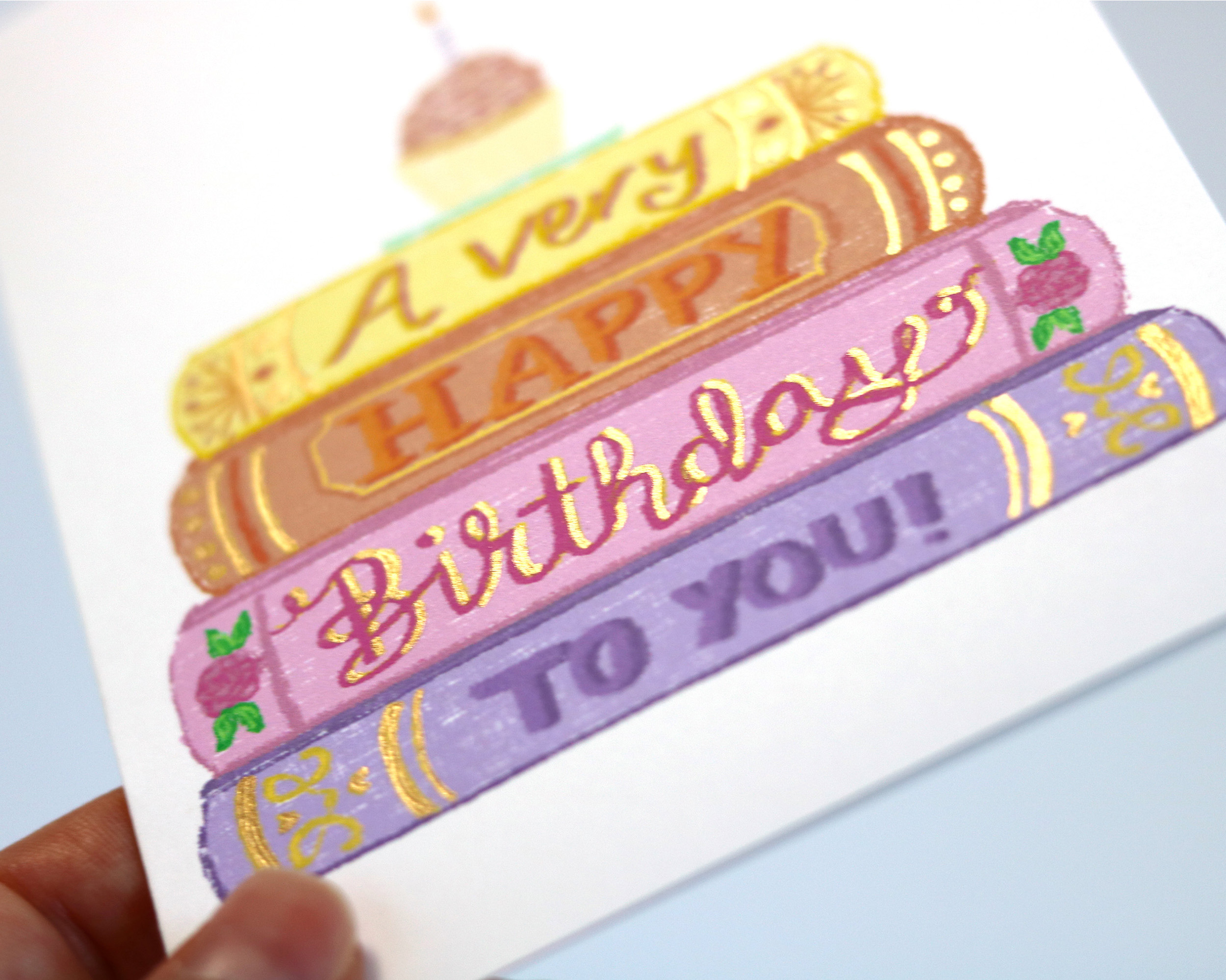 Our illustrated stack of books is made to look like the fanciest books in a library complete with frilly lettering and shiny gold details. There’s even a tiny cupcake with sprinkles on top because it’s not a birthday without some kind of cake!