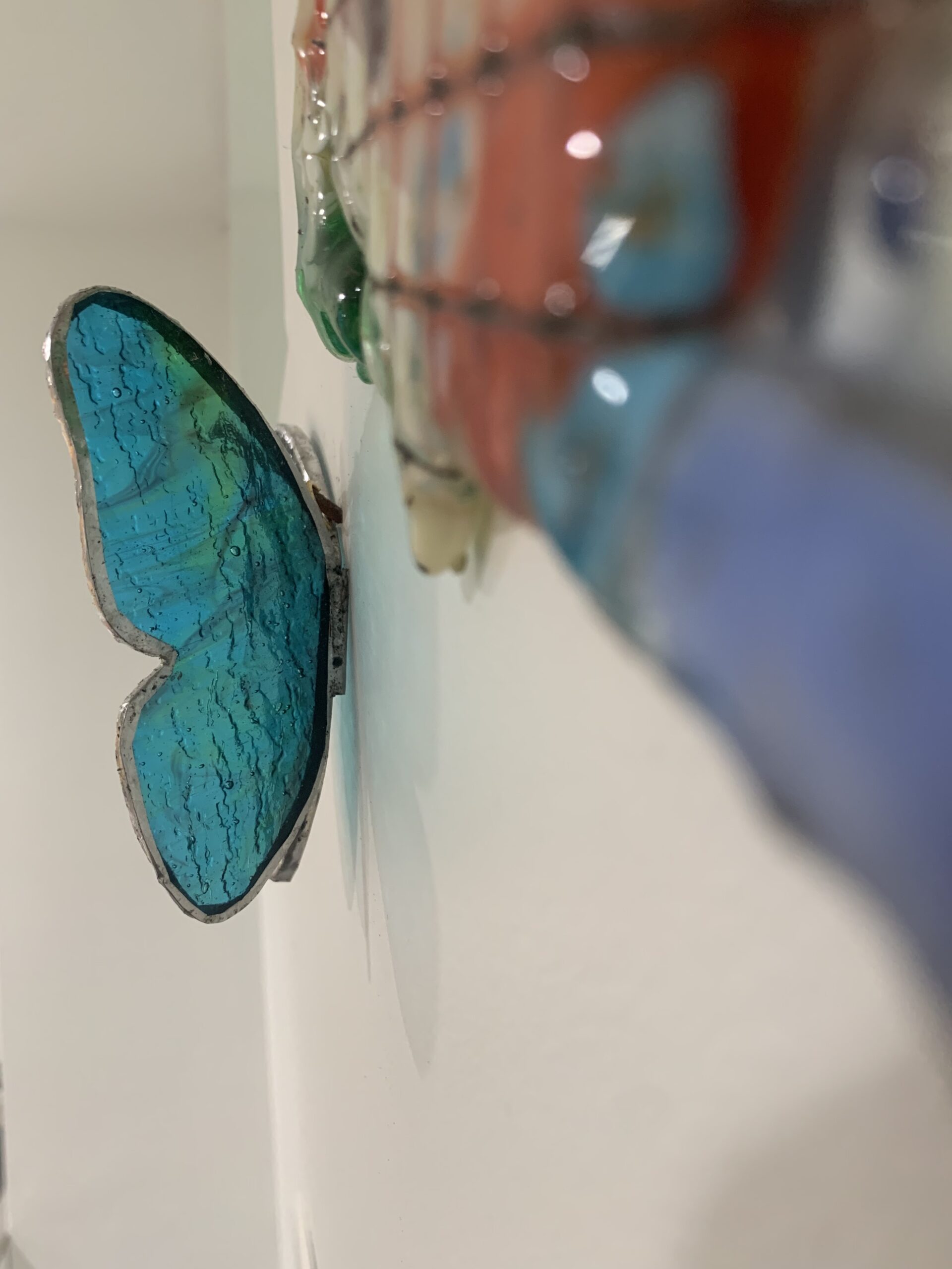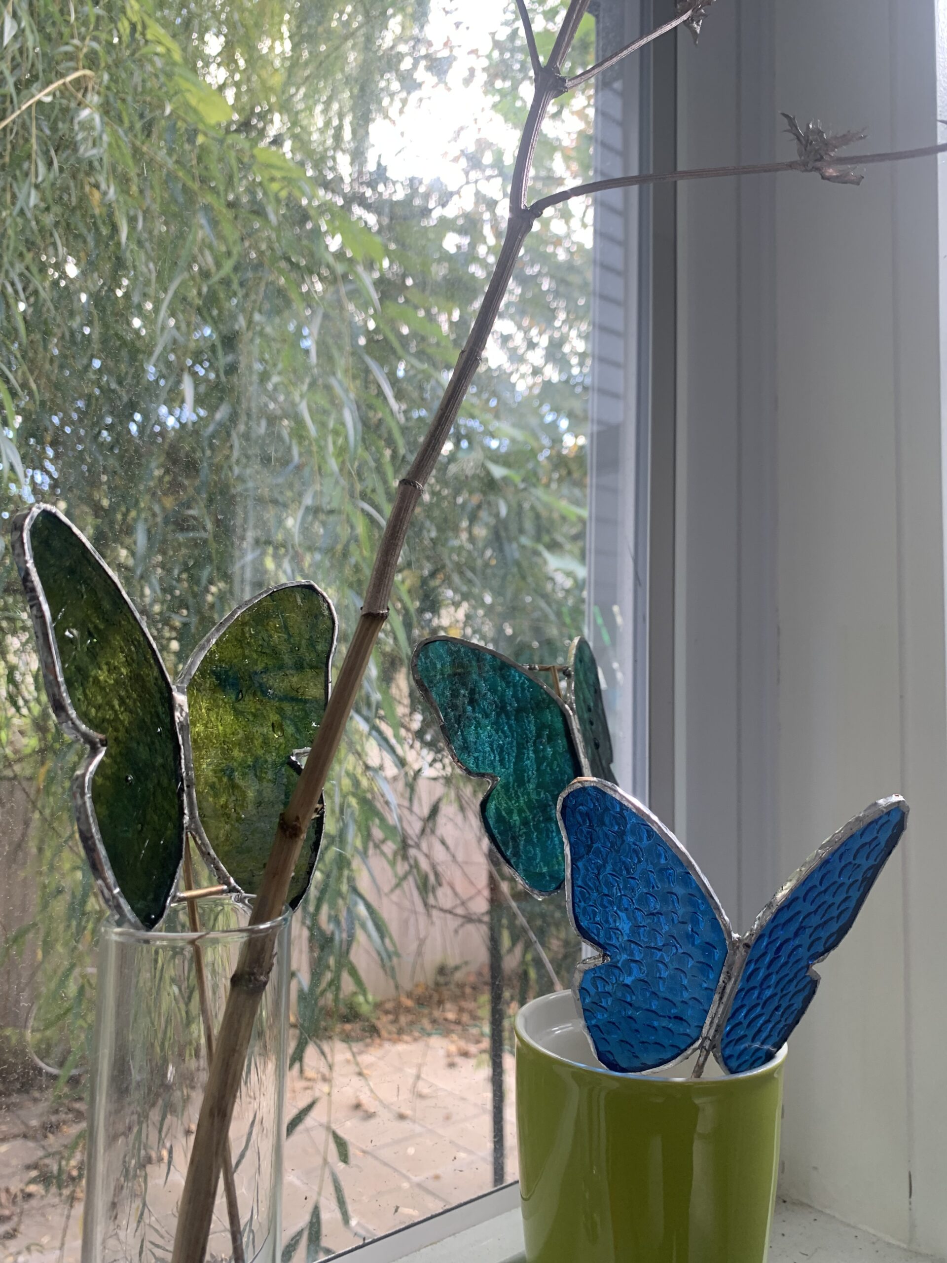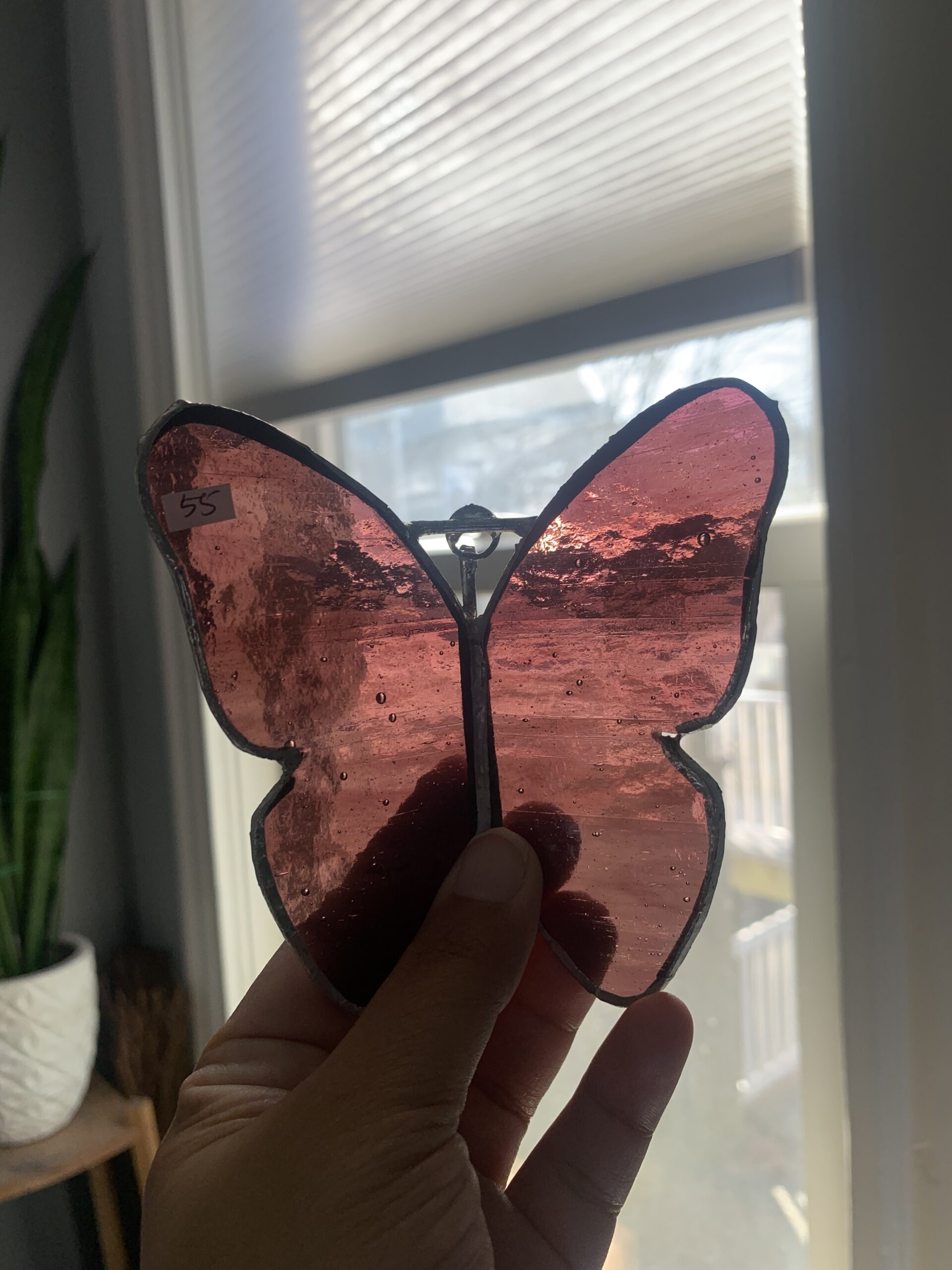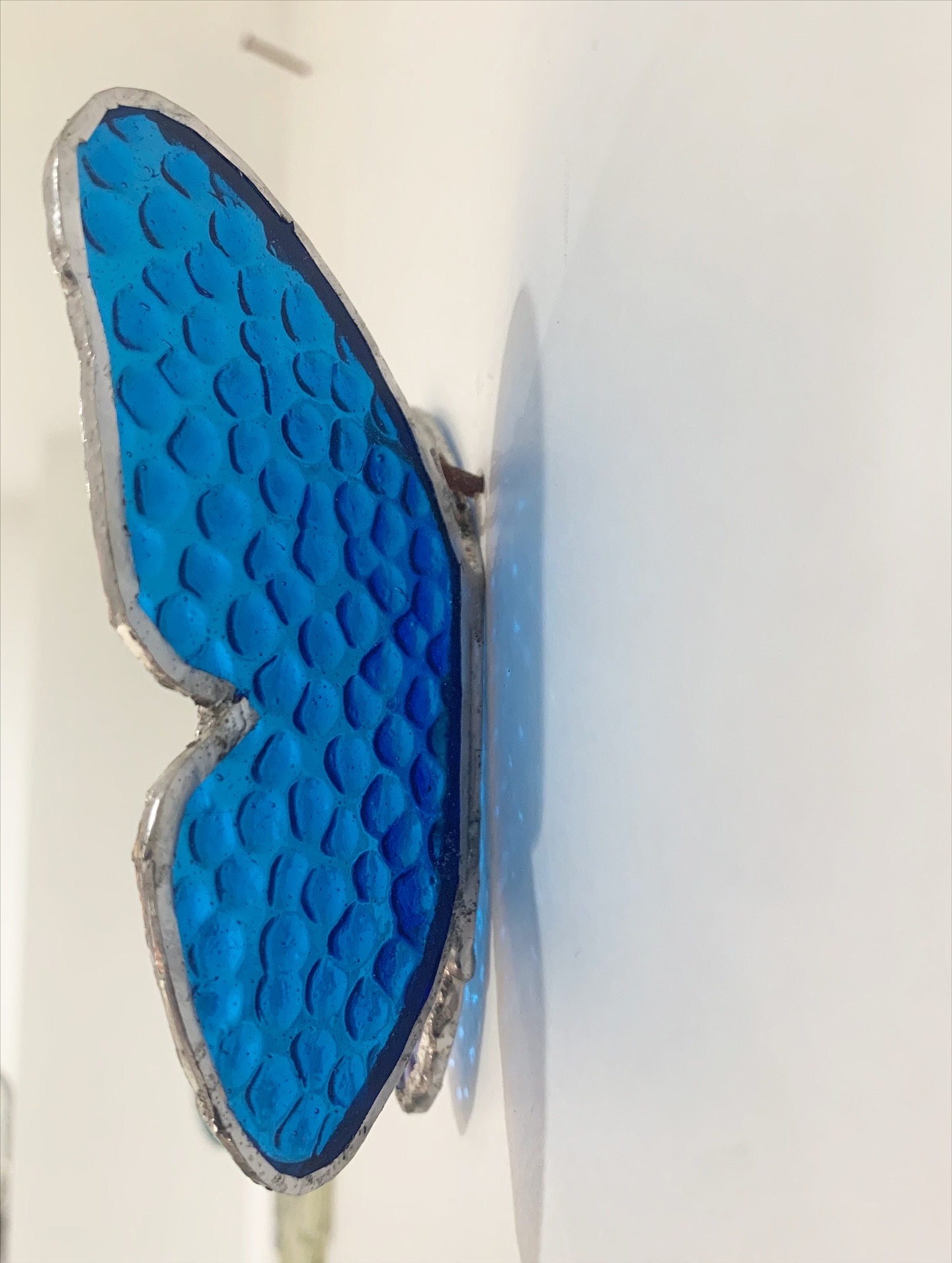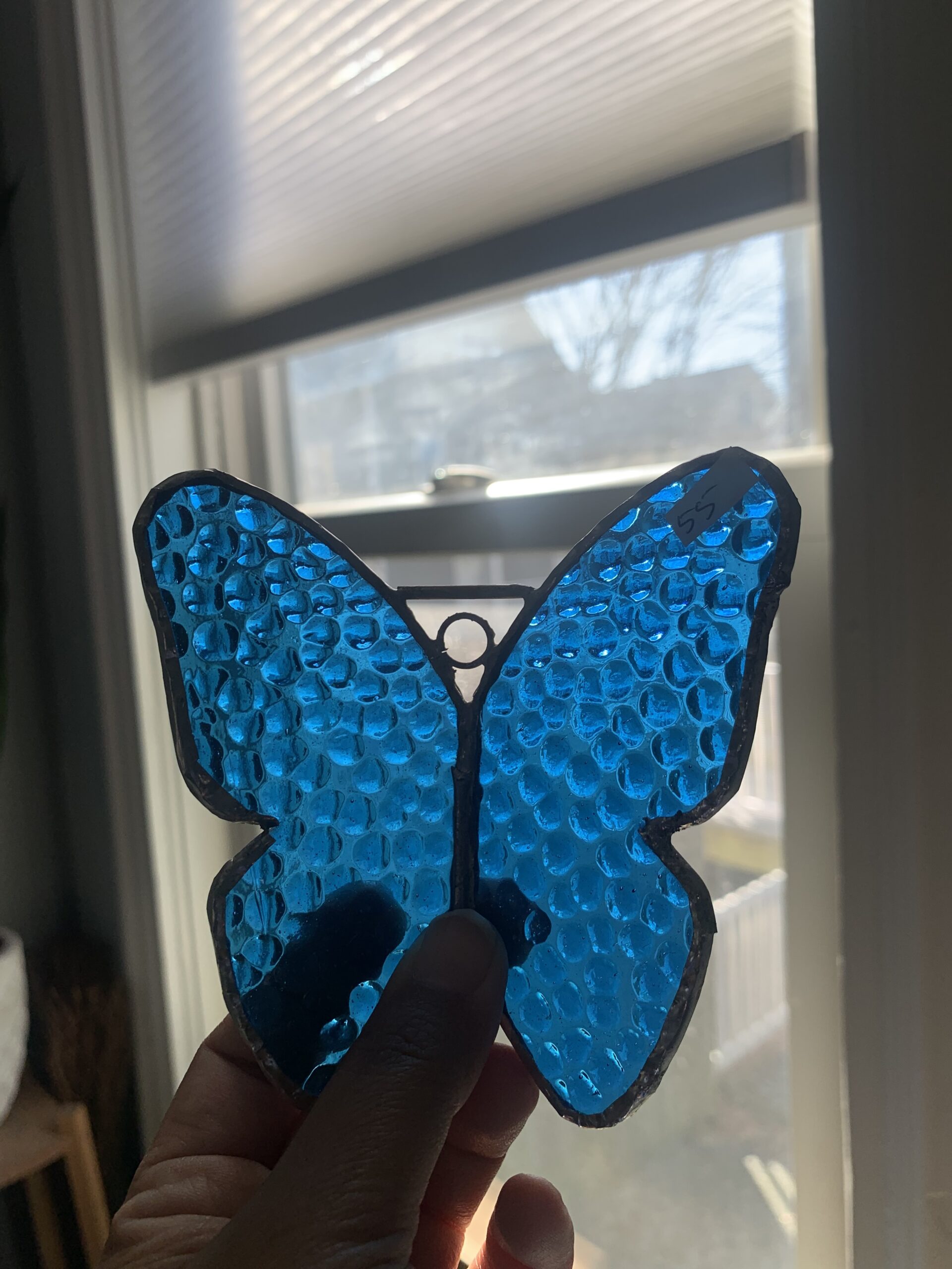 This handmade stained glass butterfly hangs on the wall from a single nail, allowing light to pass freely through the glass. As it catches sunlight or ambient indoor light, the wings expand into vibrant, colorful shadows that shift throughout the day, adding movement, warmth, and a sense of quiet transformation to your space.