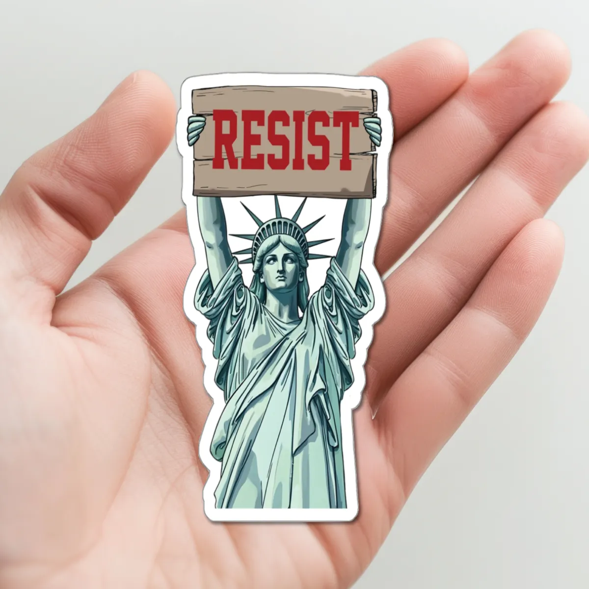 Make a statement with our Statue Of Liberty Resist die-cut stickers. These matte stickers are great for both indoor and outdoor use as they are made with thick, resistant, laminate vinyl material. Can be removed from most surfaces without causing damage. Measures 2″x3″. All our stickers are professionally printed on the highest quality vinyl and are weather-resistant and fade resistant. They can be placed on car windows, water bottles, laptops and more!