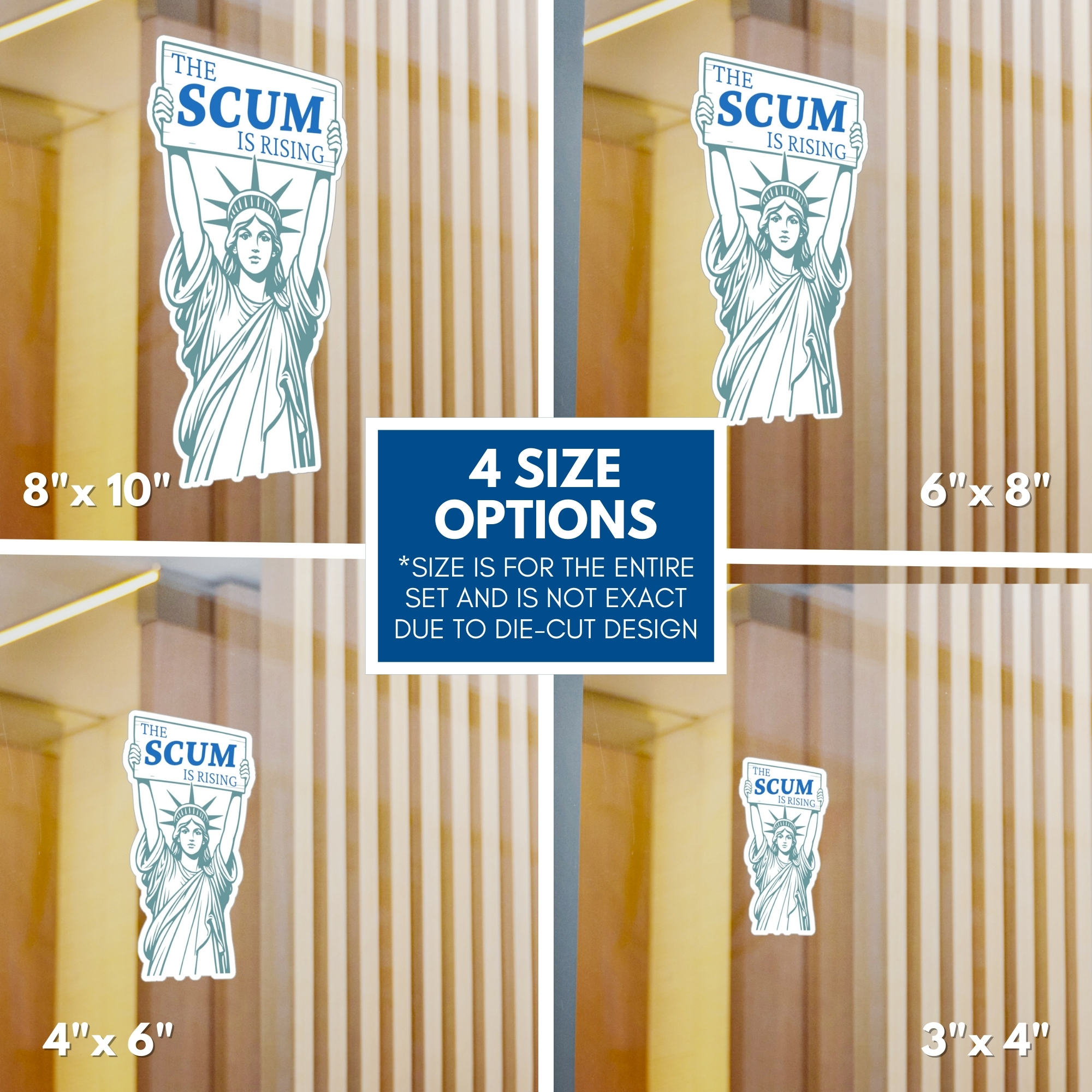 A bold kiss-cut vinyl decal that blends satirical edge with street-ready durability. Printed on satin white vinyl, this sticker shows a stylized Statue of Liberty holding a sign reading “THE SCUM IS RISING” in crisp blue tones. The satin finish keeps colors vivid without glare, while water-, scratch-, and UV-resistant inks maintain contrast and detail outdoors for up to three years. A subtle 1/8″ white kiss-cut border gives a clean outline and makes peeling and applying simple. Use it to add a provocative, political, or “scummy” touch to laptops, water bottles, windows, skate decks, or any flat surface where it can spark conversation.