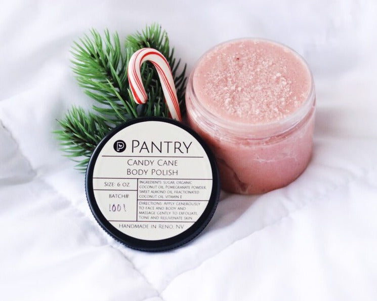 Welcome the holiday season with our refreshing Candy Cane Body Polish — a festive favorite that exfoliates, hydrates, and delights the senses. Handcrafted with peppermint + vanilla essential oils and tinted a soft pink using organic pomegranate powder, this scrub feels, smells, and looks like pure holiday cheer.