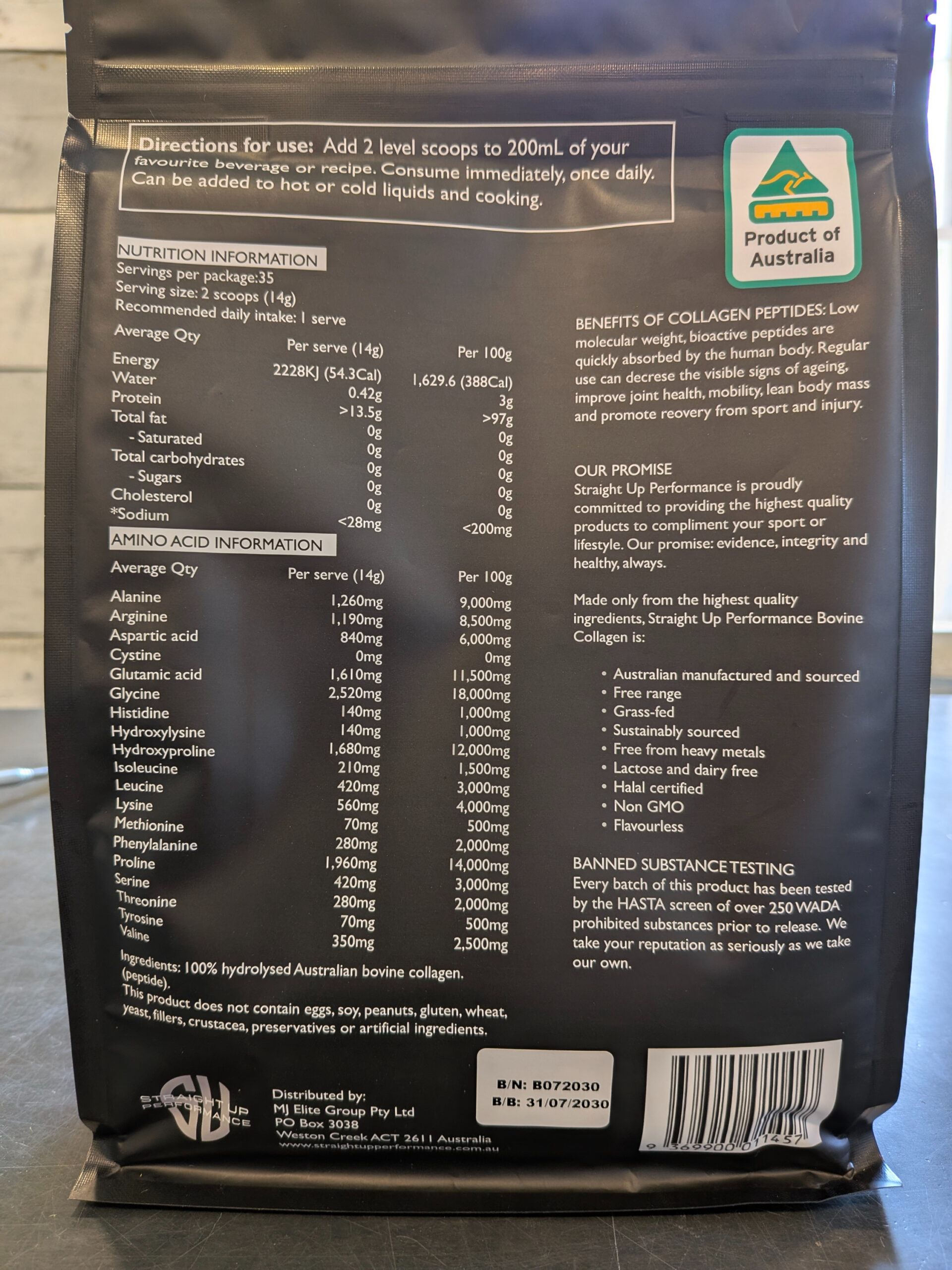 Straight Up Performance Grass-fed Bovine Collagen Peptides are sourced from small family farms in Australia. We are very excited to finally be able to bring you an ethically produced collagen peptide powder!