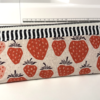 A lightweight canvas pencil pouch with a cute strawberry print, striped accent, and metal zipper.