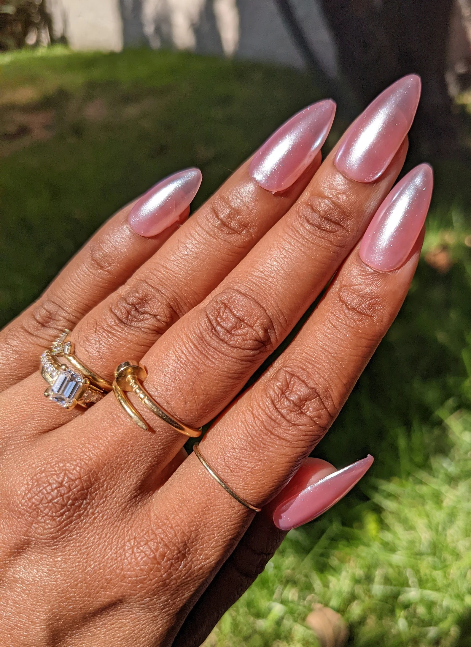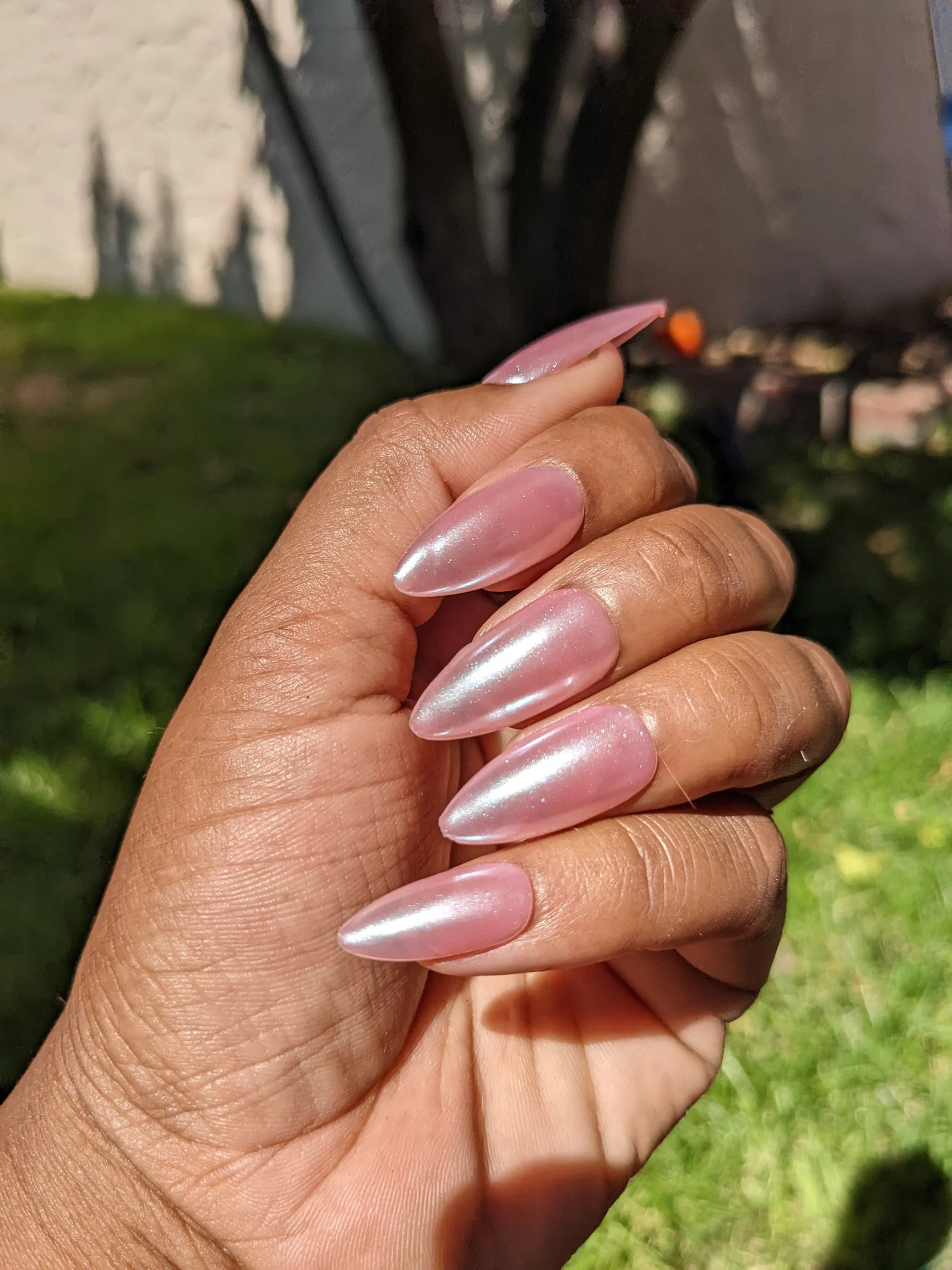 You know these nails — you’ve seen them on Instagram, you’ve seen them on Hailey Bieber, now it’s time to see them on you, this time in pink! A beautiful throwback to the early 2000s with a sheer pink base covered in a pearly chrome powder. A classic!
