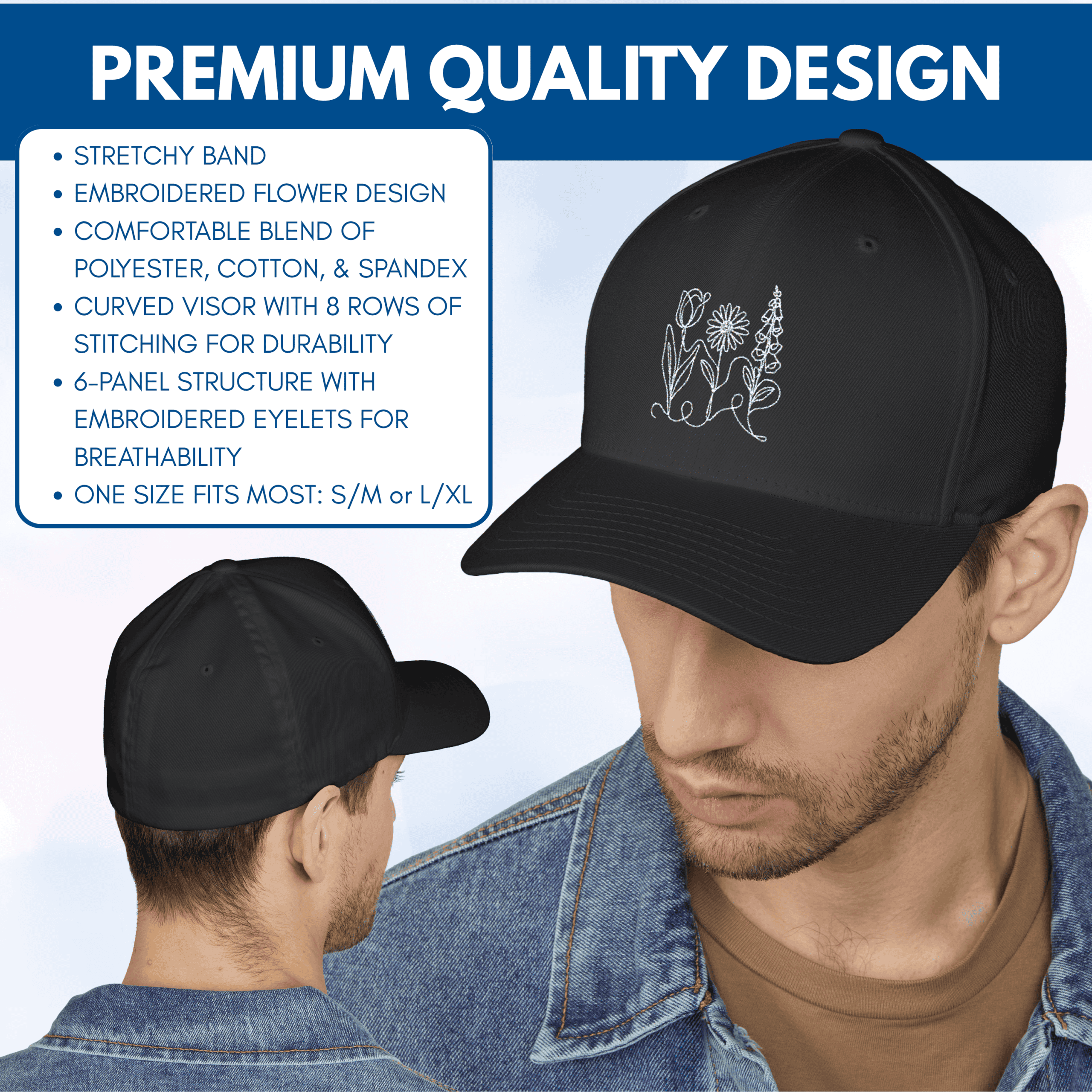 - Six-panel structure with embroidered eyelets for breathability