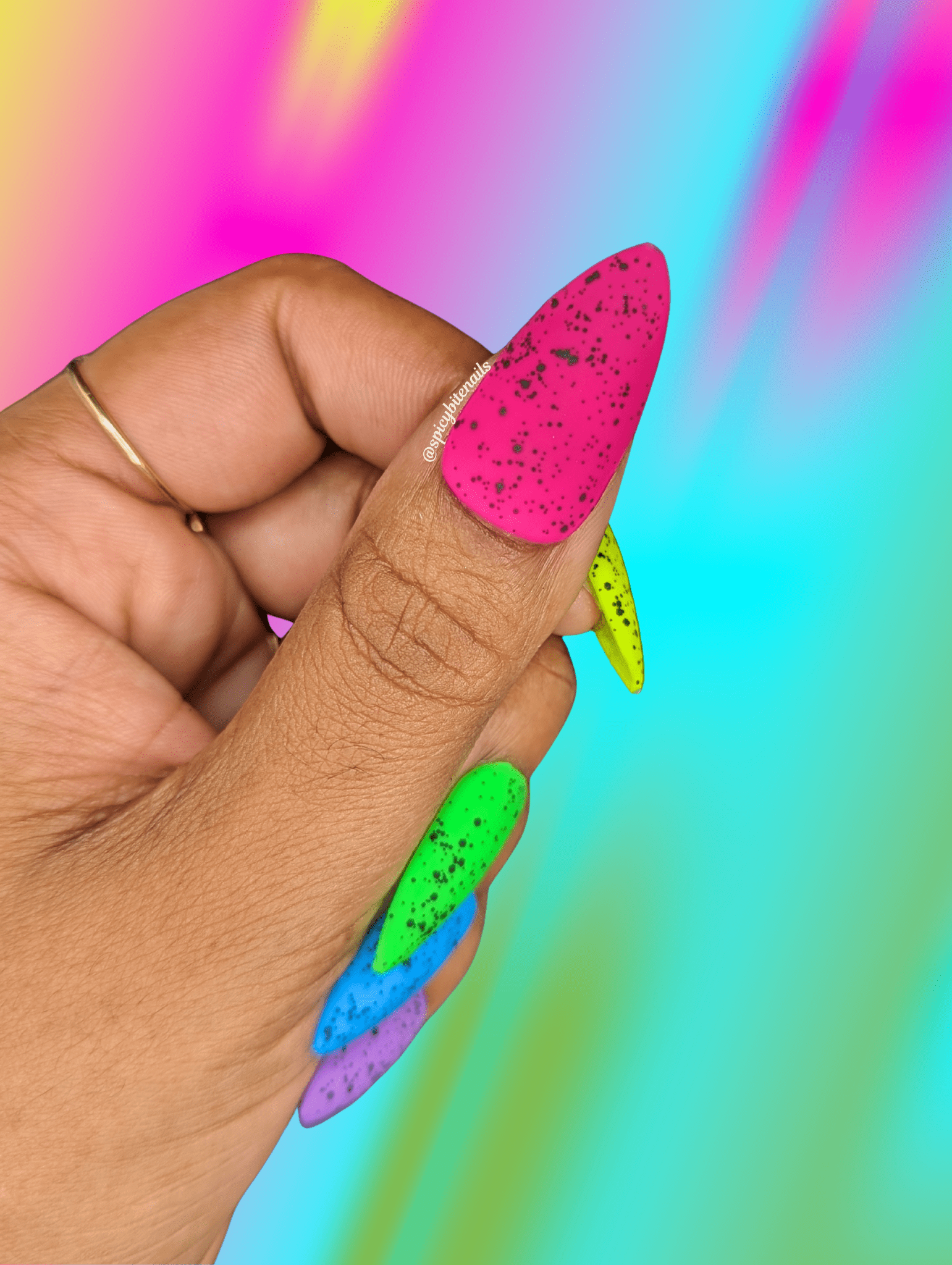 At least you can channel all of that with these 90s inspired neon nails. They feature a bright neon rainbow with a speckled matte top coat. So fun!
