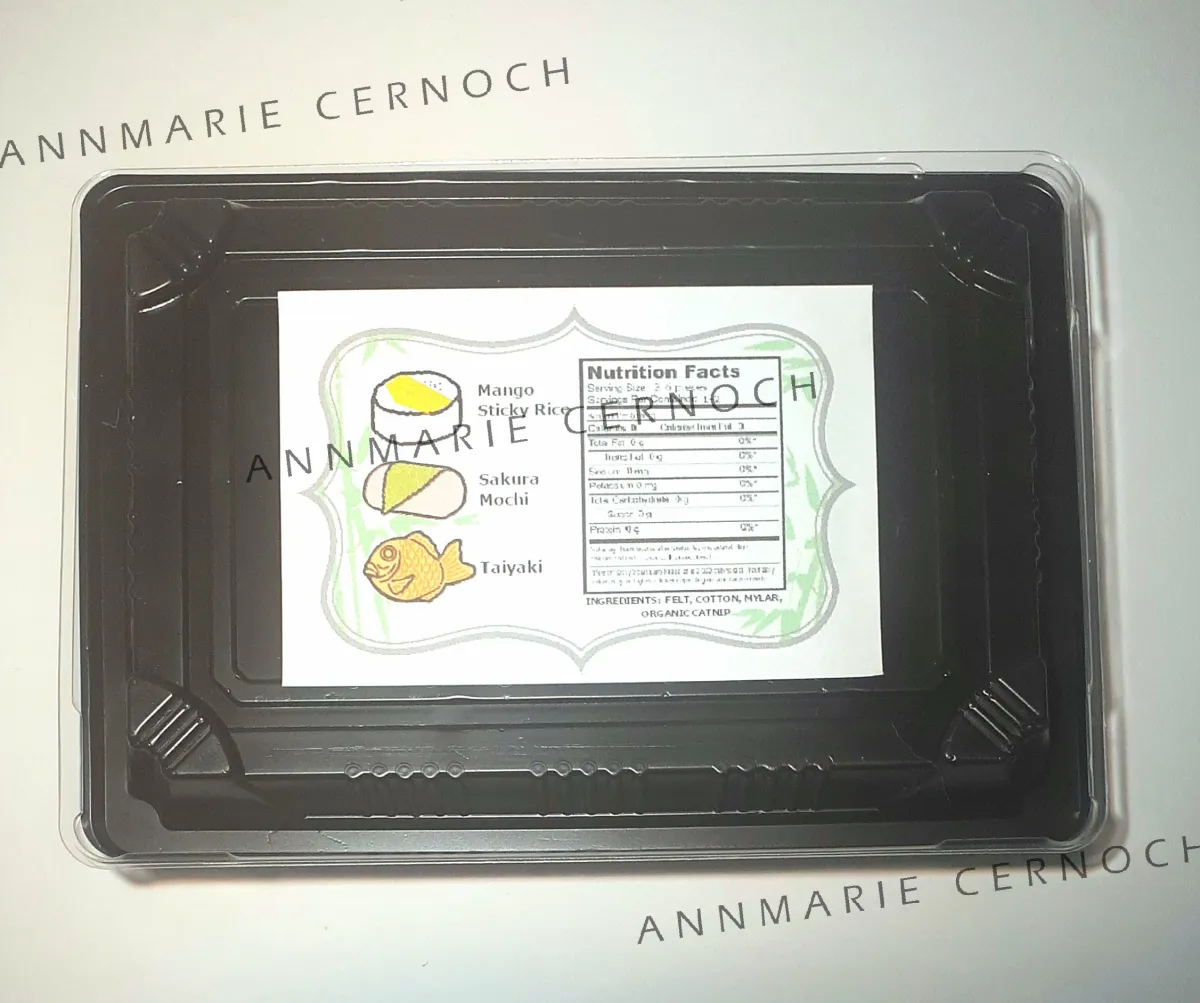 Toys are packaged in a traditional sushi take out box (packaging is getting hard to find, so it may vary slightly from pictures).