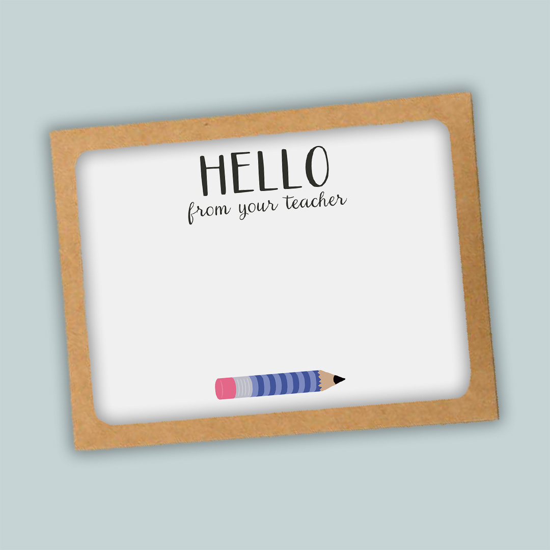 - “Hello from Teacher” with pencil design in your choice of yellow, pink, or blue