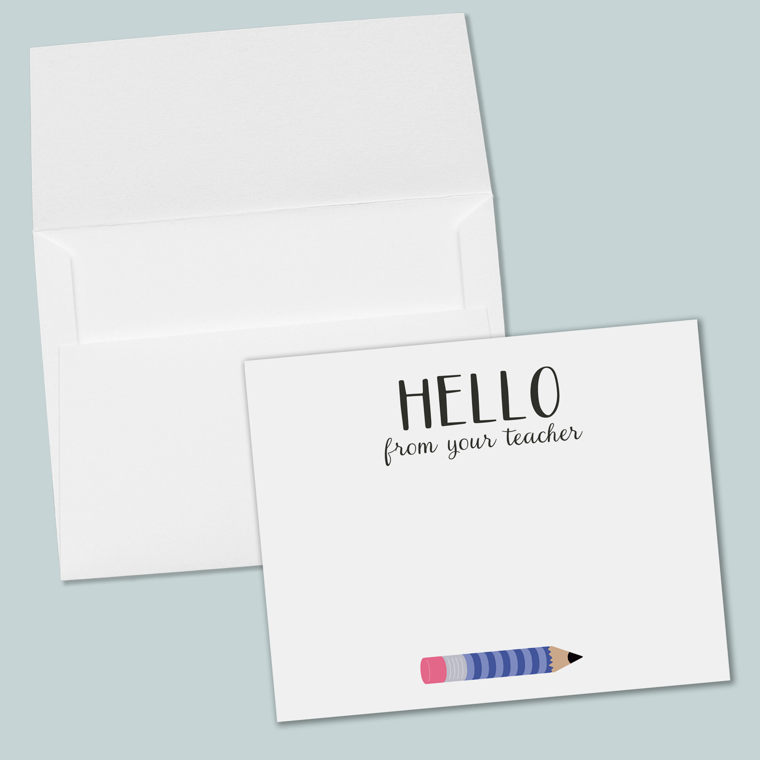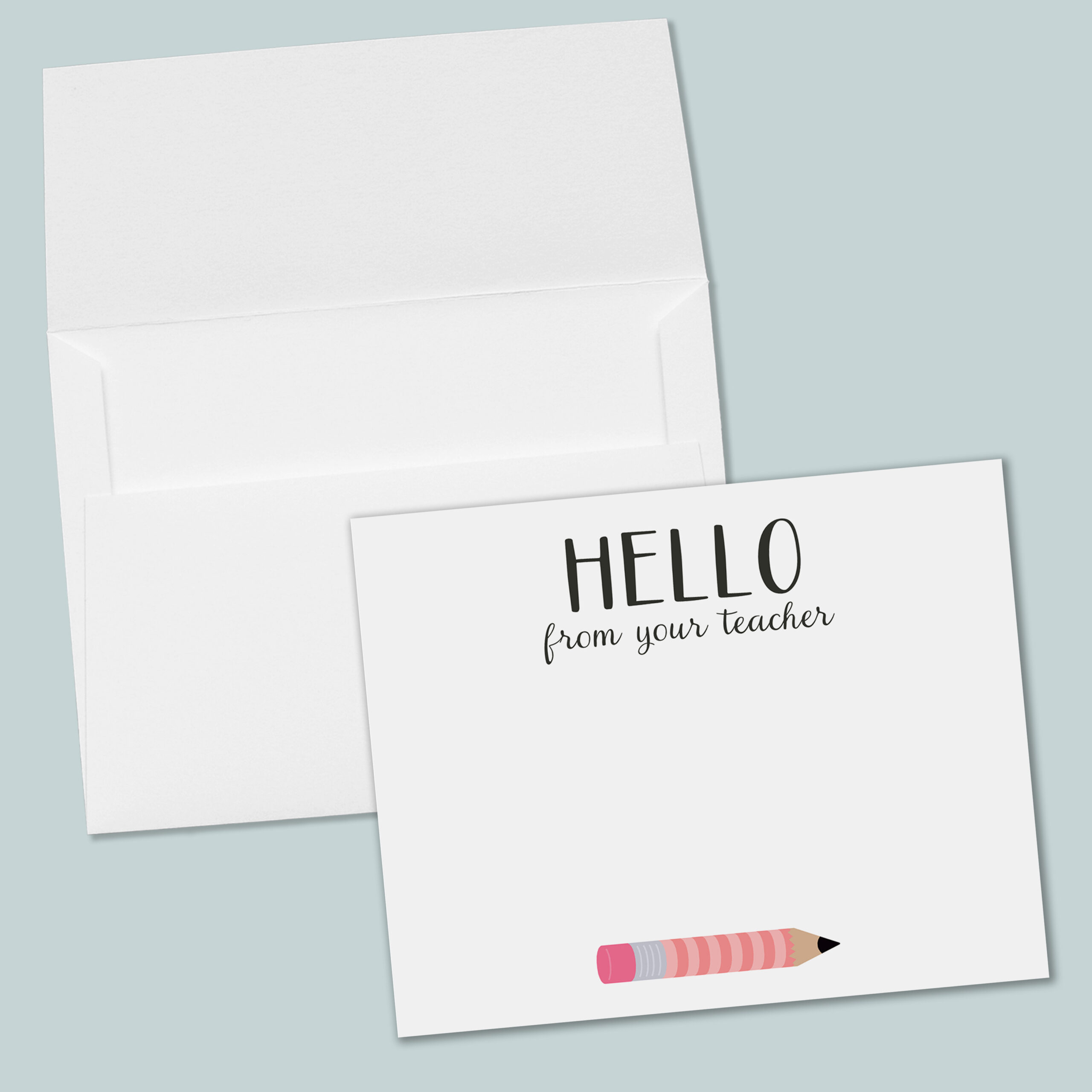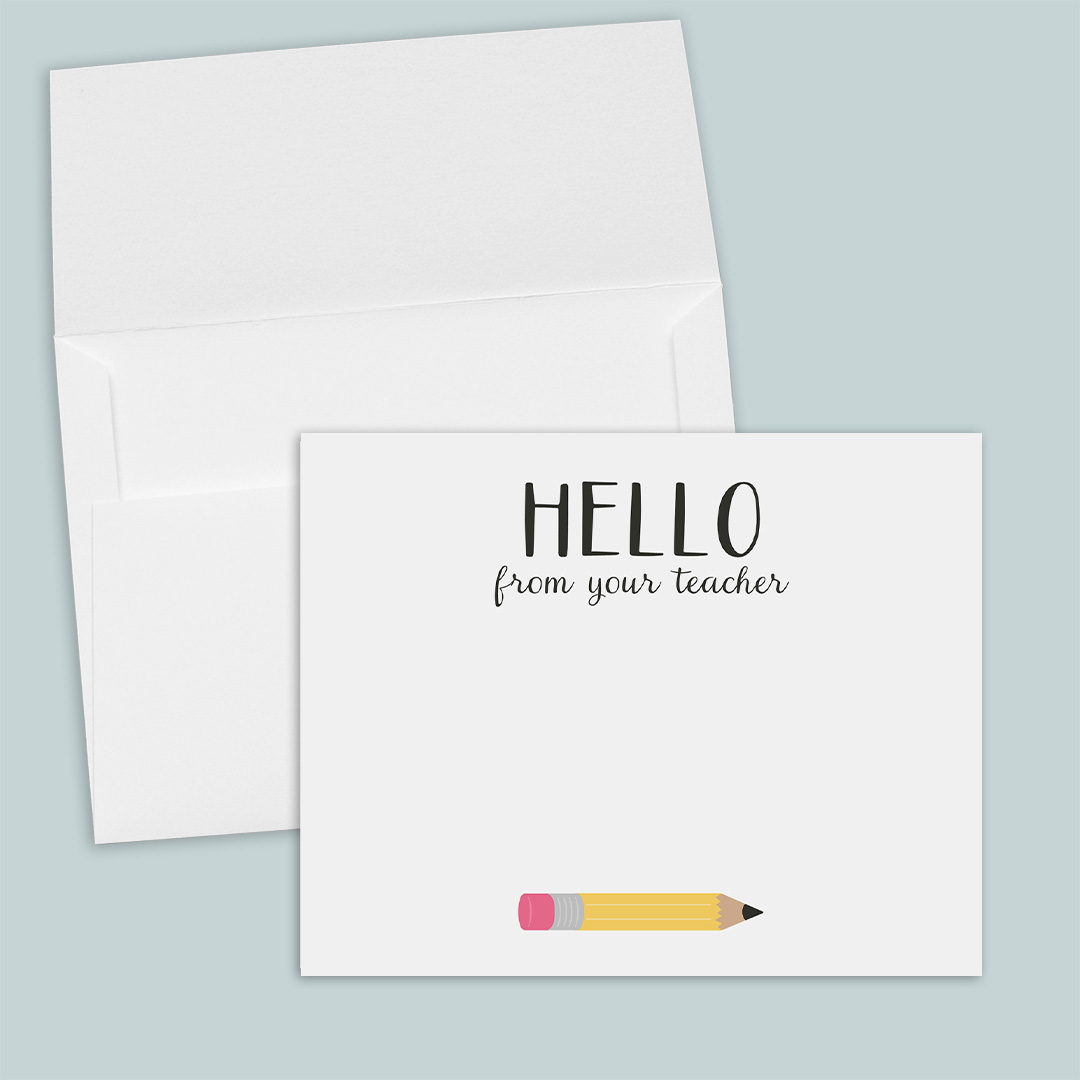 Teacher pencil note cards make classroom communication simple and professional! These charming flat note cards feature “Hello from Teacher” with a colorful pencil design available in yellow, pink, or blue—perfect for sending notes home to parents, acknowledging student achievements, or connecting with colleagues. Whether you’re communicating about classroom updates, expressing appreciation, or sending encouragement, these cards help teachers build positive relationships with students, families, and fellow educators.