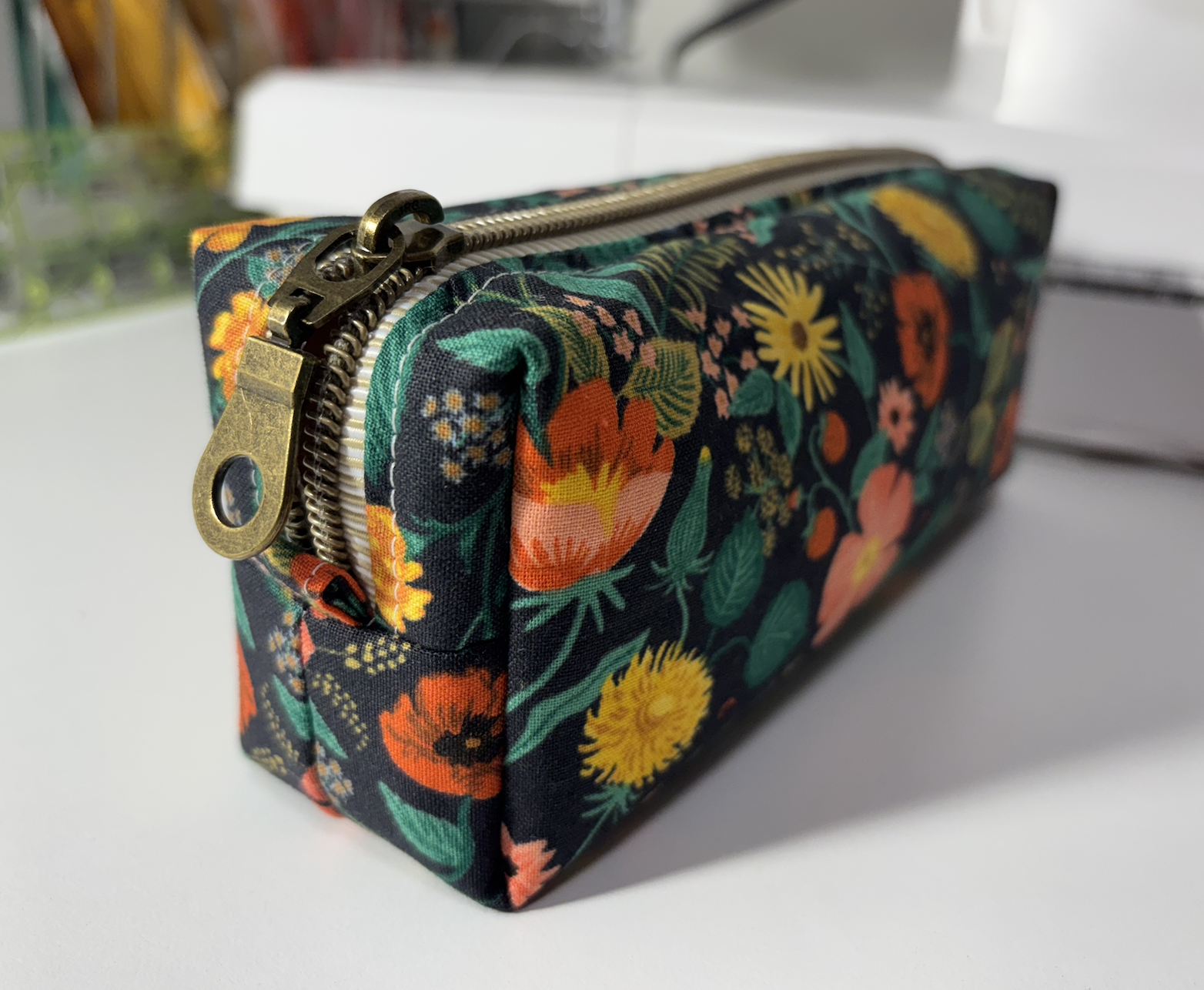 This medium size zipper pouch could be used a larger pencil case or a toiletries bag. The outer lining is a super cute teacup and teapot print, and the zipper has an O-ring pull. There are small tabs on either end of the zipper that make it easy to open close. This bag has only a very lightweight interfacing between the outer and lining fabrics, meaning it can be easily packed and flattened when not in use. This particular cotton fabric is prone to wrinkled and may need ironed to look its best.