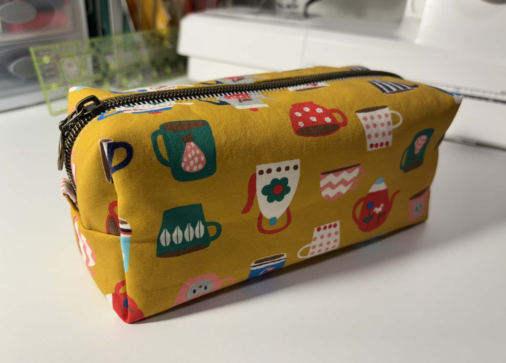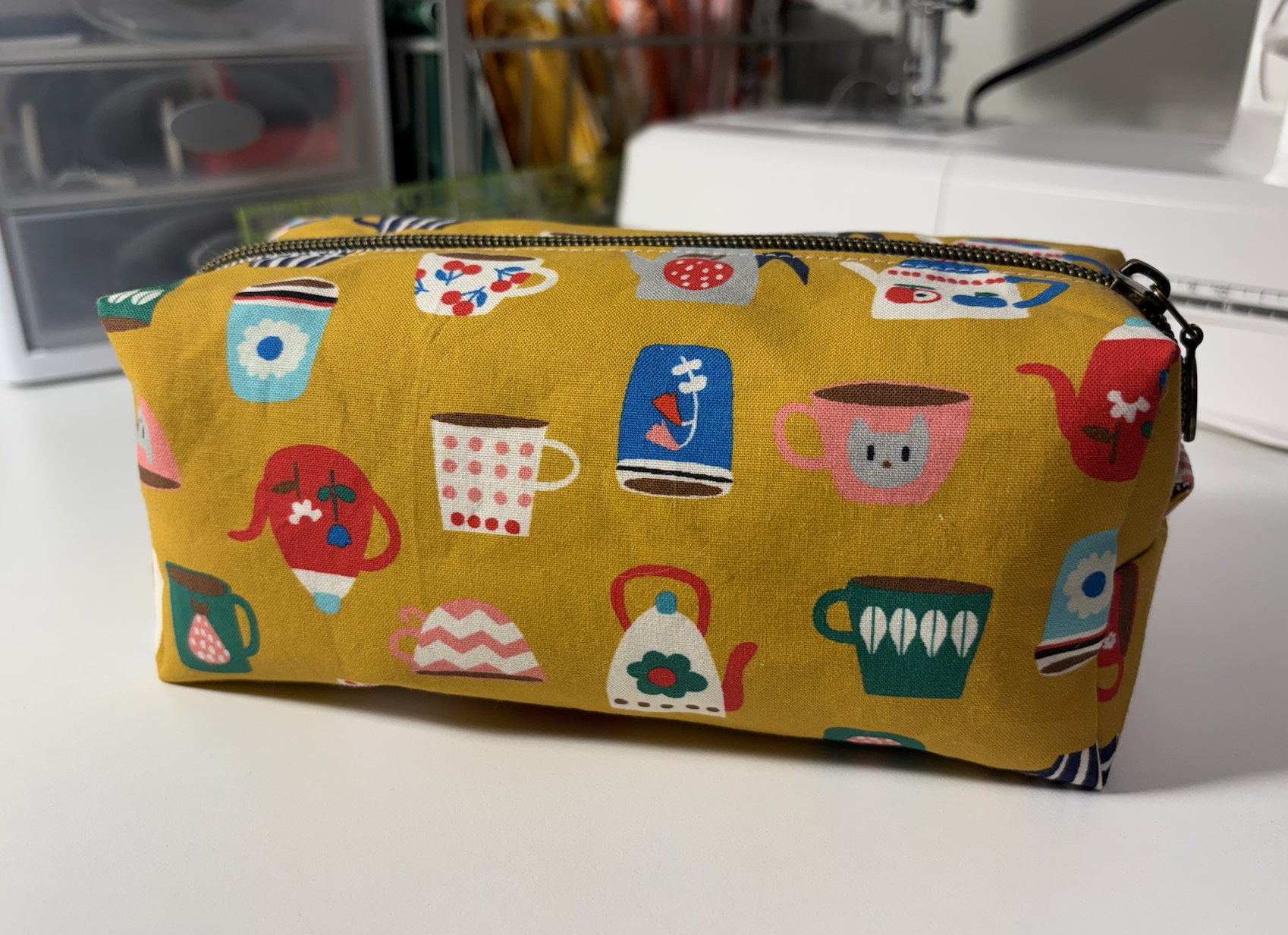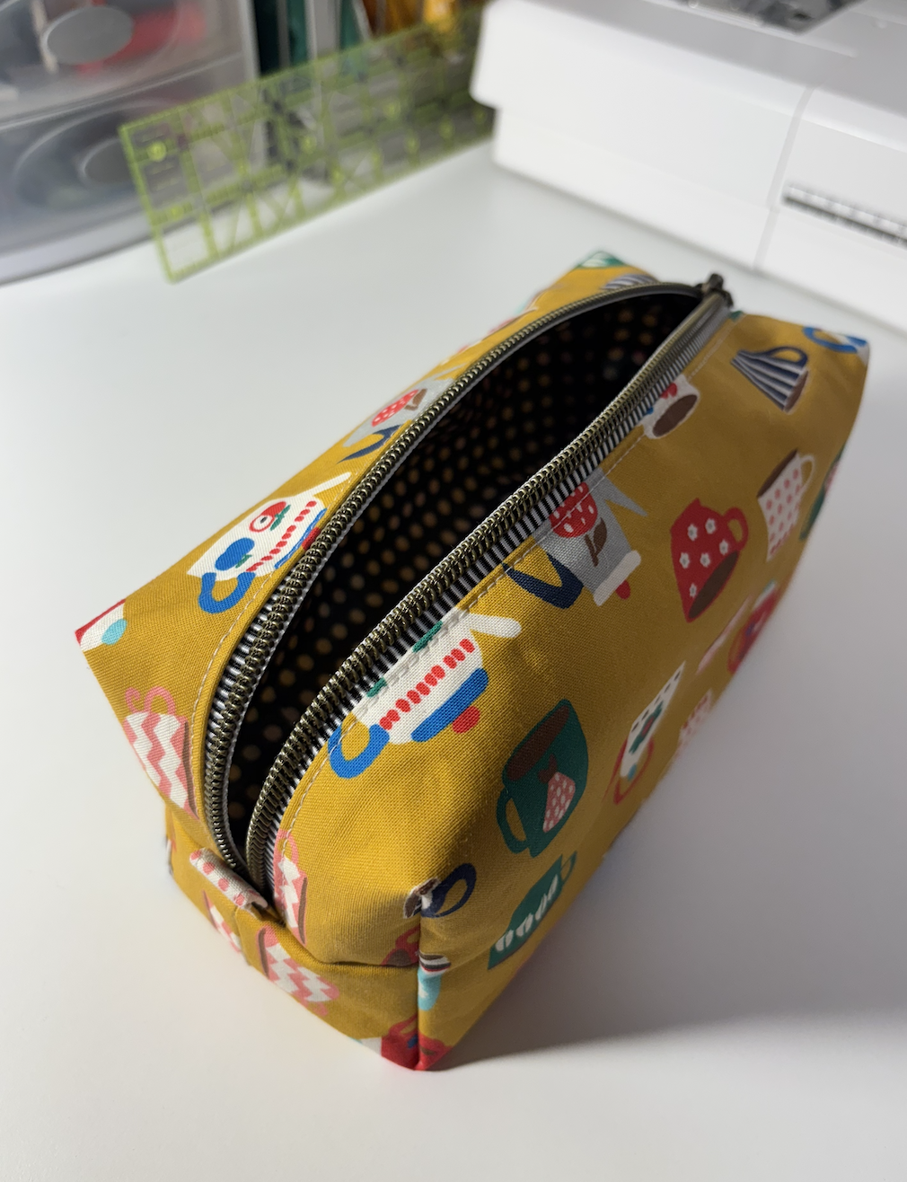This medium size zipper pouch could be used a larger pencil case or a toiletries bag. The outer lining is a super cute teacup and teapot print, and the zipper has an O-ring pull. There are small tabs on either end of the zipper that make it easy to open close. This bag has only a very lightweight interfacing between the outer and lining fabrics, meaning it can be easily packed and flattened when not in use. This particular cotton fabric is prone to wrinkled and may need ironed to look its best.
