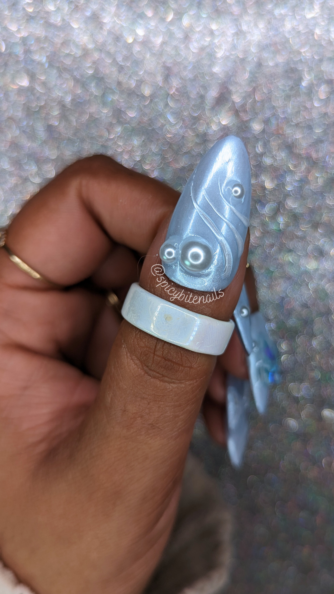 You’ll be the cutest mermaid on the block with these baby blue and white glazed coquette pearl nails. They have cute little bows for that coquette vibe and some 3D swirls. For the ultimate girly moment.
