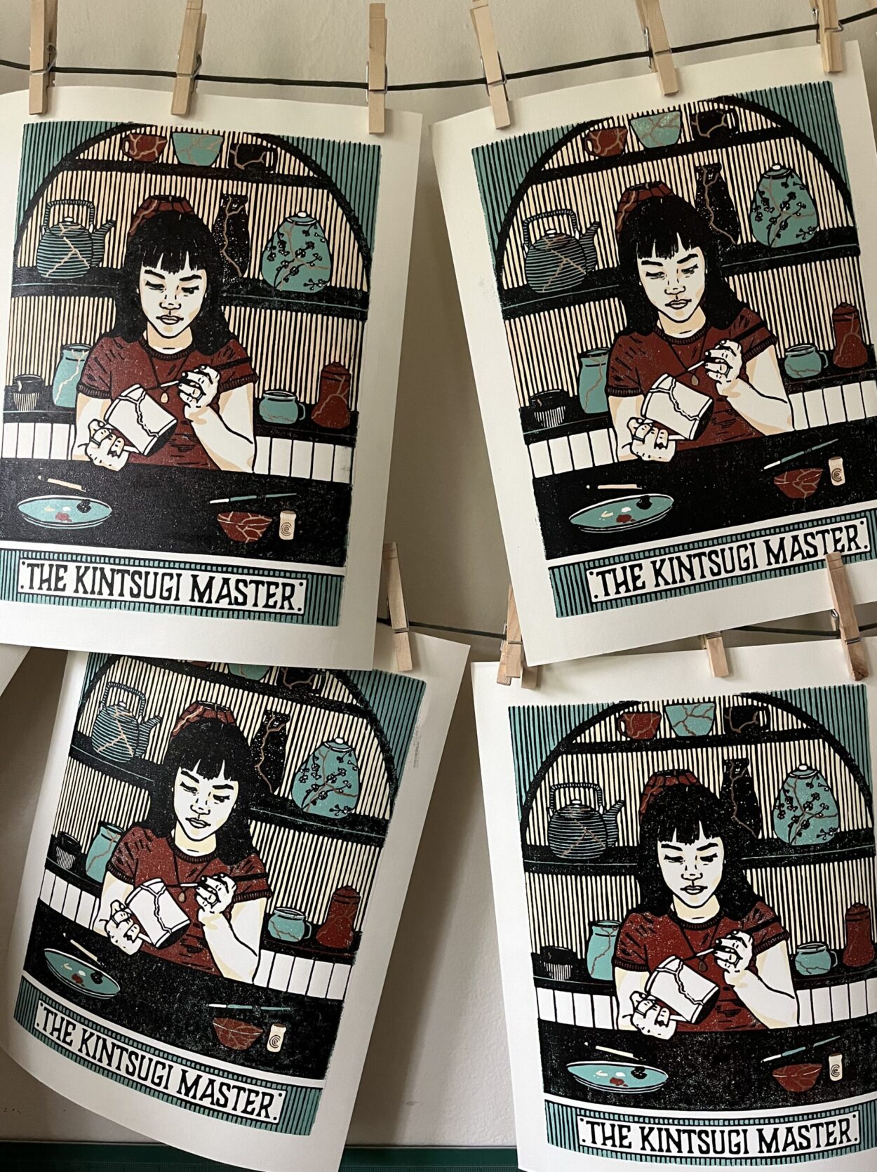 The Gardener is the second print in a series which will later be made into an oracle deck with a book of meanings. Each print in the series is a limited edition reduction print. Reduction printmaking is the process of making a multi-layer, multi-color print from one linoleum block. After one layer is carved and printed with a specific color, this process is repeated until the last color is applied to the block. By the end of the process, the block is ruined and cannot create the same artwork again.