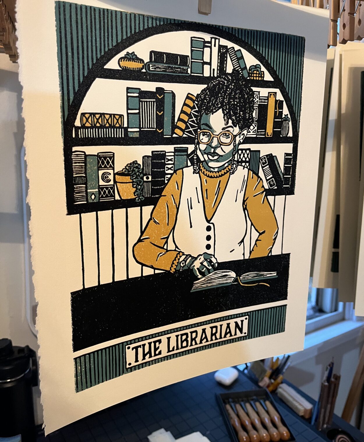 A reduction linoleum block print of “The Gardener,” later to become an oracle card in an oracle deck made by the artist.