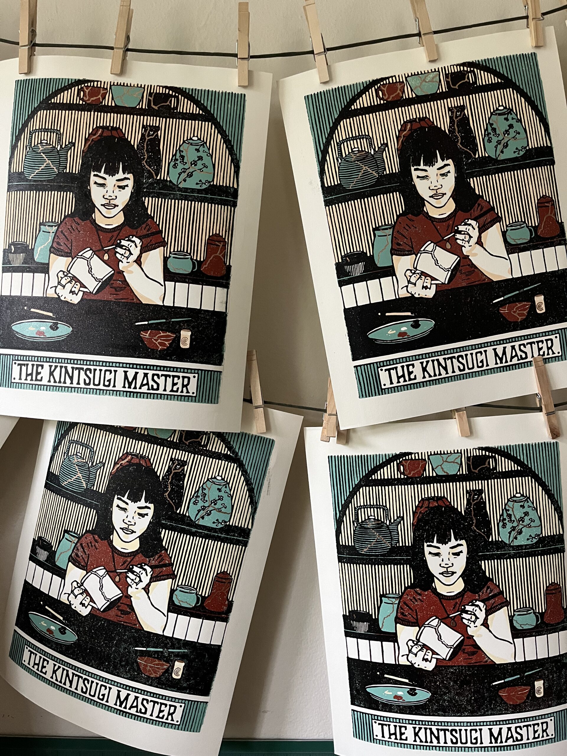 The Kintsugi Master is the third print in a series which will later be made into an oracle deck with a book of meanings. Each print in the series is a limited edition reduction print. Reduction printmaking is the process of making a multi-layer, multi-color print from one linoleum block. After one layer is carved and printed with a specific color, this process is repeated until the last color is applied to the block. By the end of the process, the block is ruined and cannot create the same artwork again.