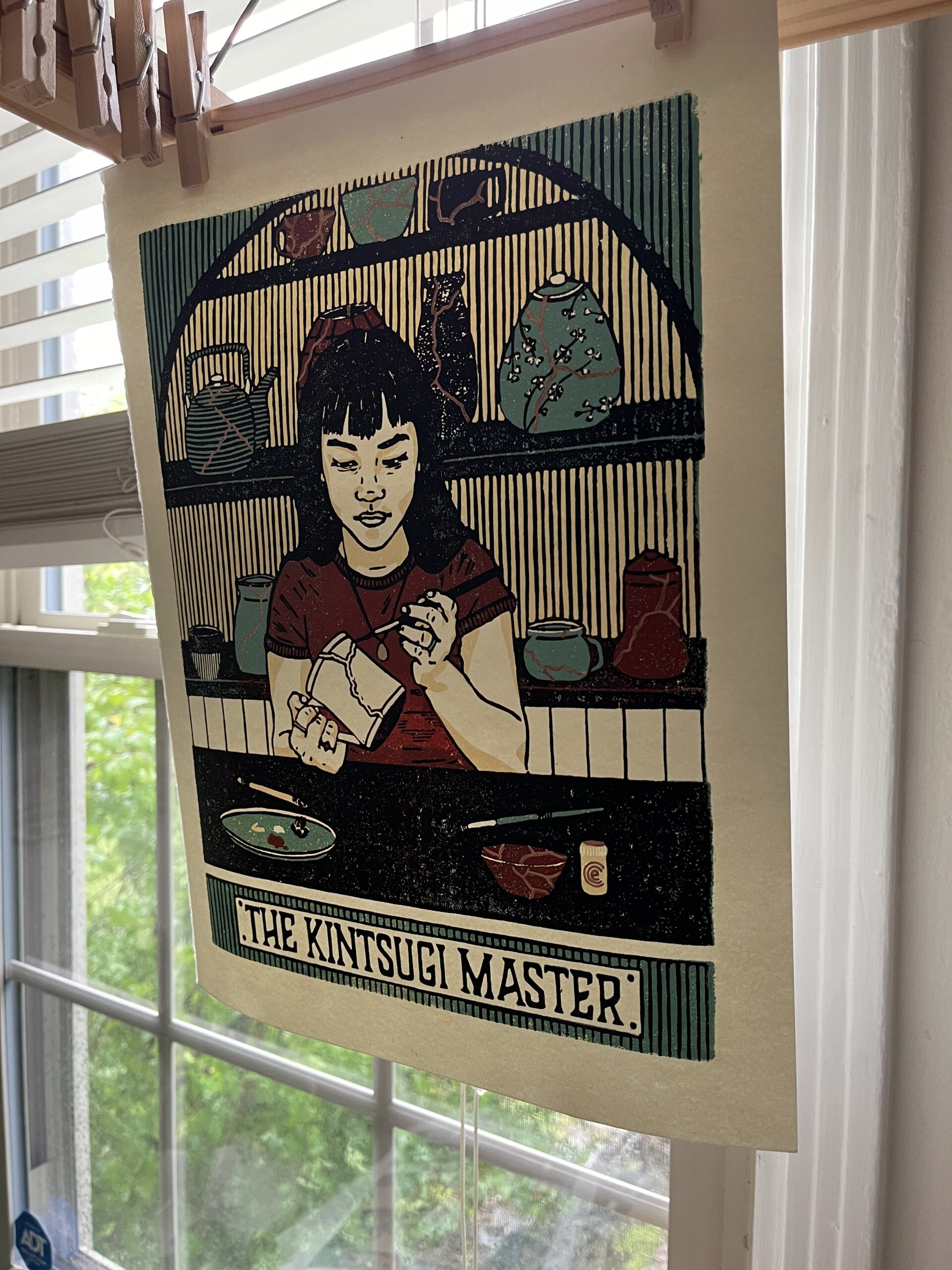 A reduction linoleum block print of “The Kintsugi Master,” later to become an oracle card in an oracle deck made by the artist.