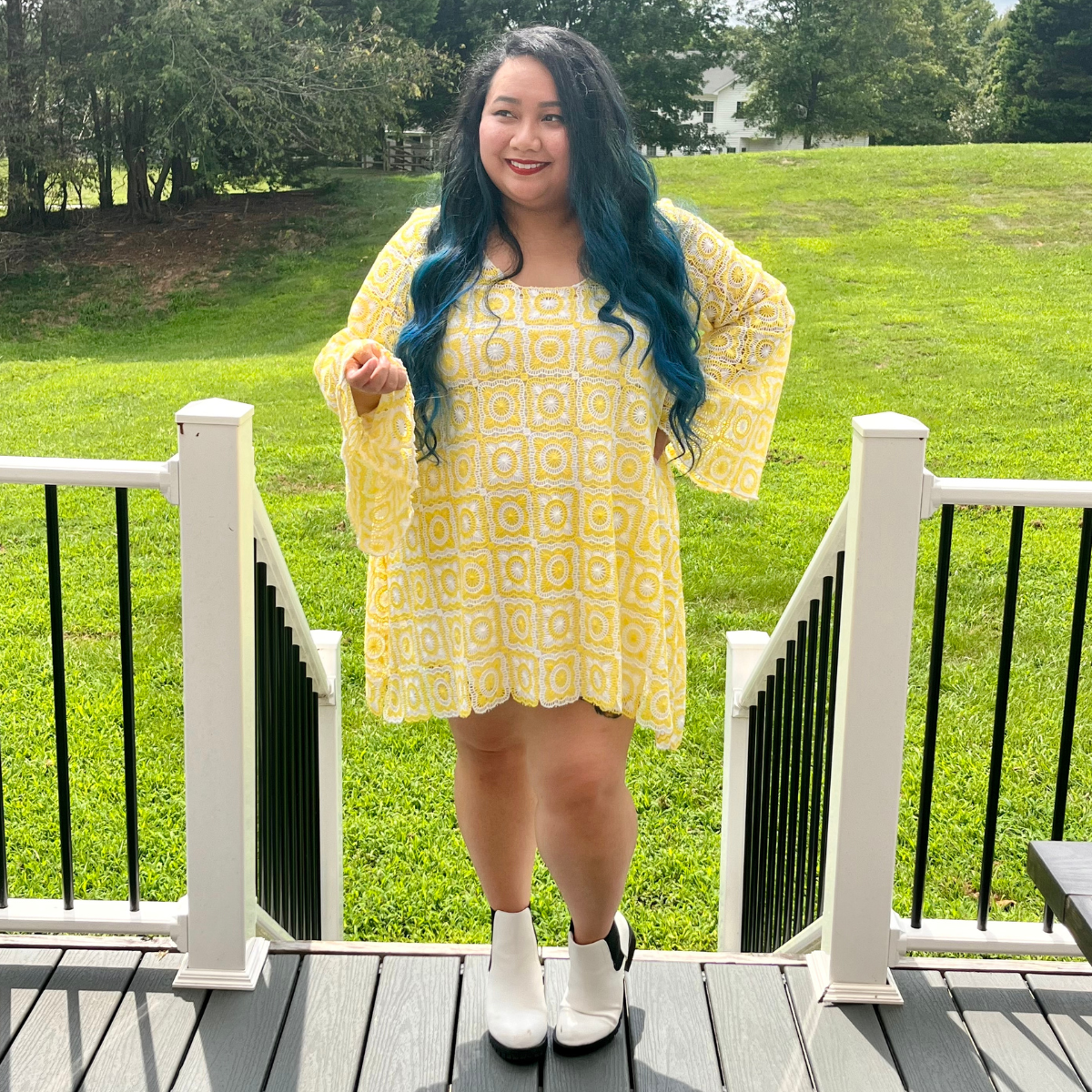 You’ll feel groovy in this mod-inspired, crochet granny square dress featuring bell sleeves.