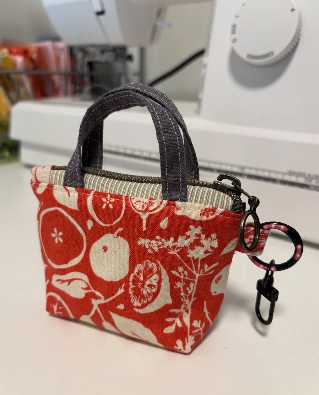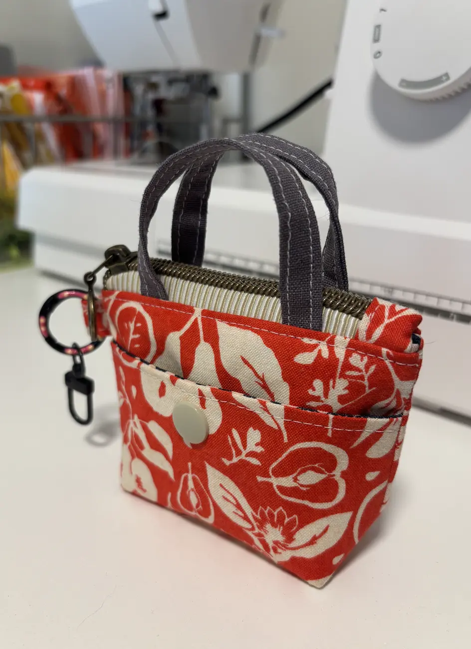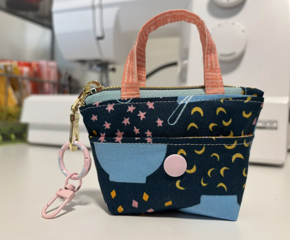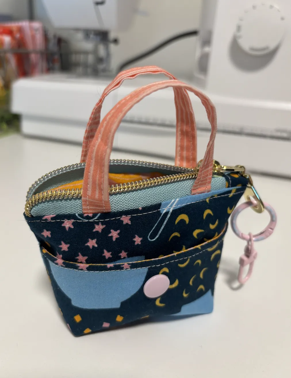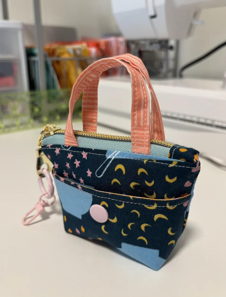 Ever felt like your tote bag needed it’s own tote bag? You’re in luck with this tiny tote keychain! This sweet little tote bag-shaped keychain with a zipper pouch, perfect to hold your earbuds, phone charger, hand sanitizer, or other small items. Outer and inner fabrics are both cotton. Features a tiny outer pocket with a snap close. Tiny Tote pattern is by Craft Owl Handmade.
