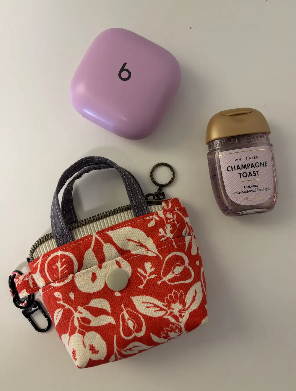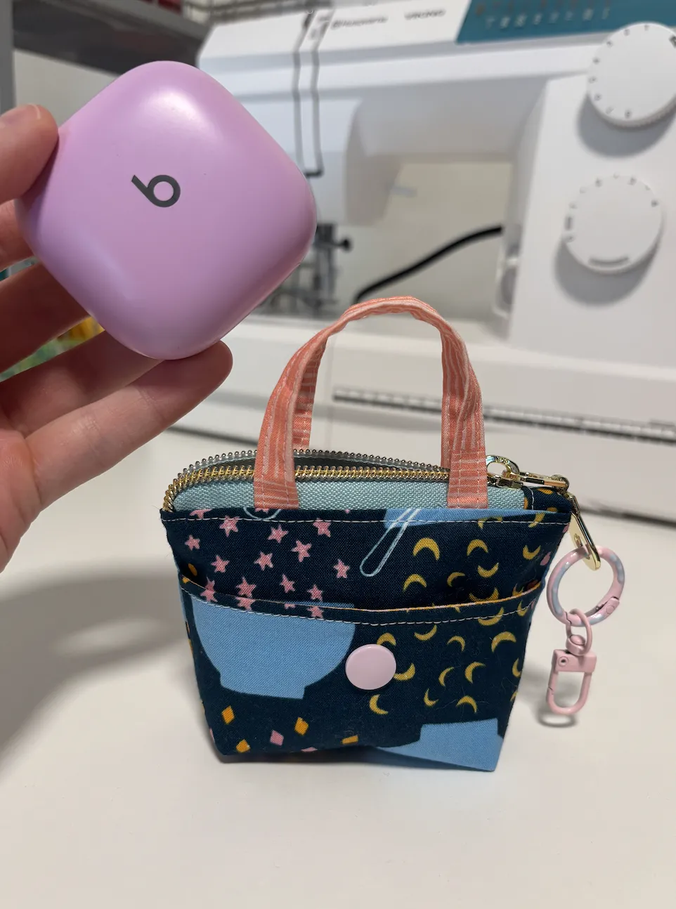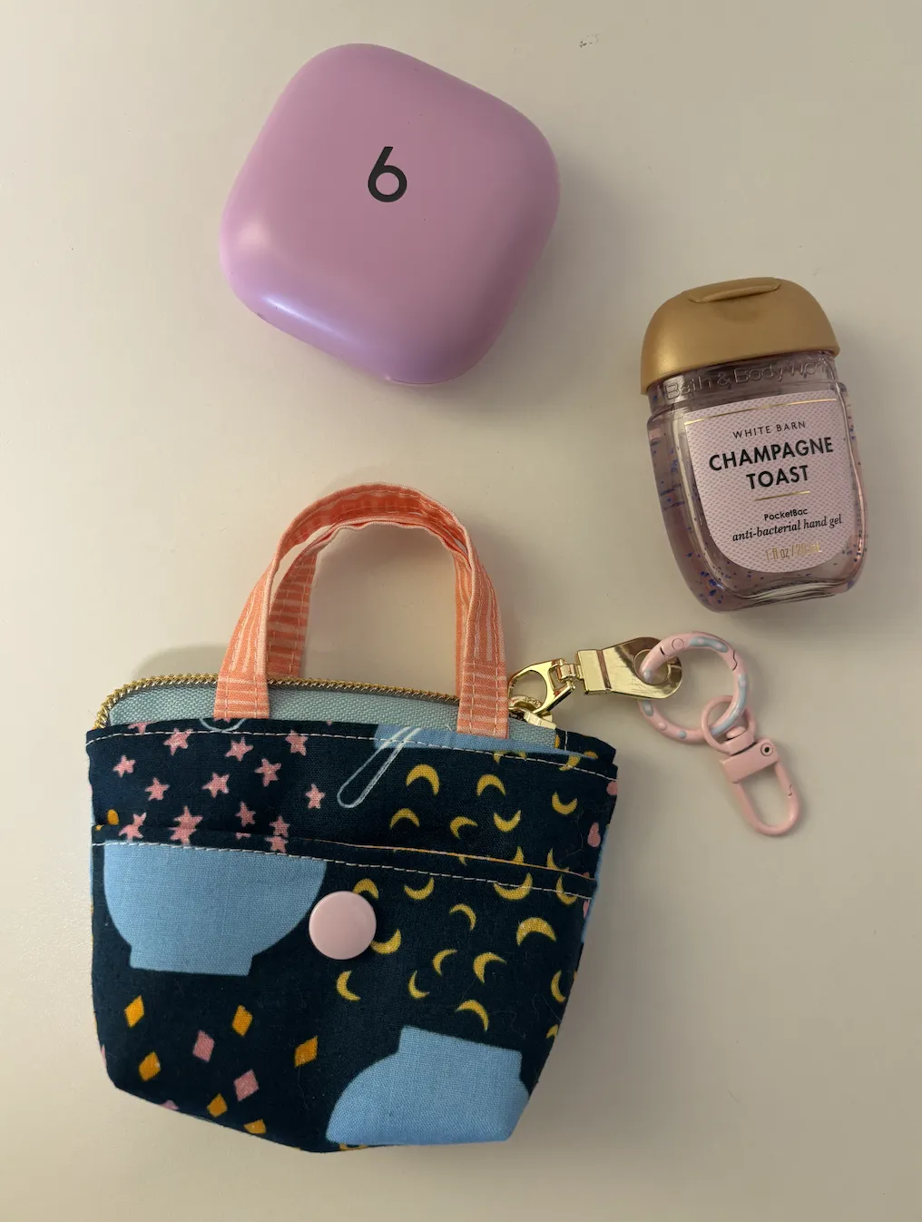 A sweet little tote bag-shaped keychain with a zipper pouch, perfect to hold your earbuds, phone charger, hand sanitizer, or other small items
