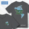 – Back-centered large map graphic with matching small chest print—cool blue and green palette