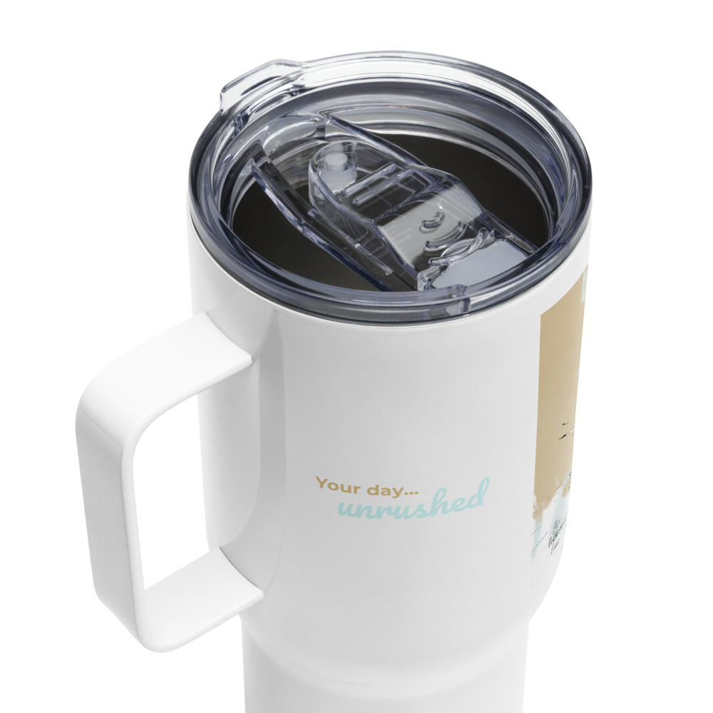 This listing is for the 25oz travel mug with handle, perfect for commutes, road trips, or mornings when you need a little extra caffeine.