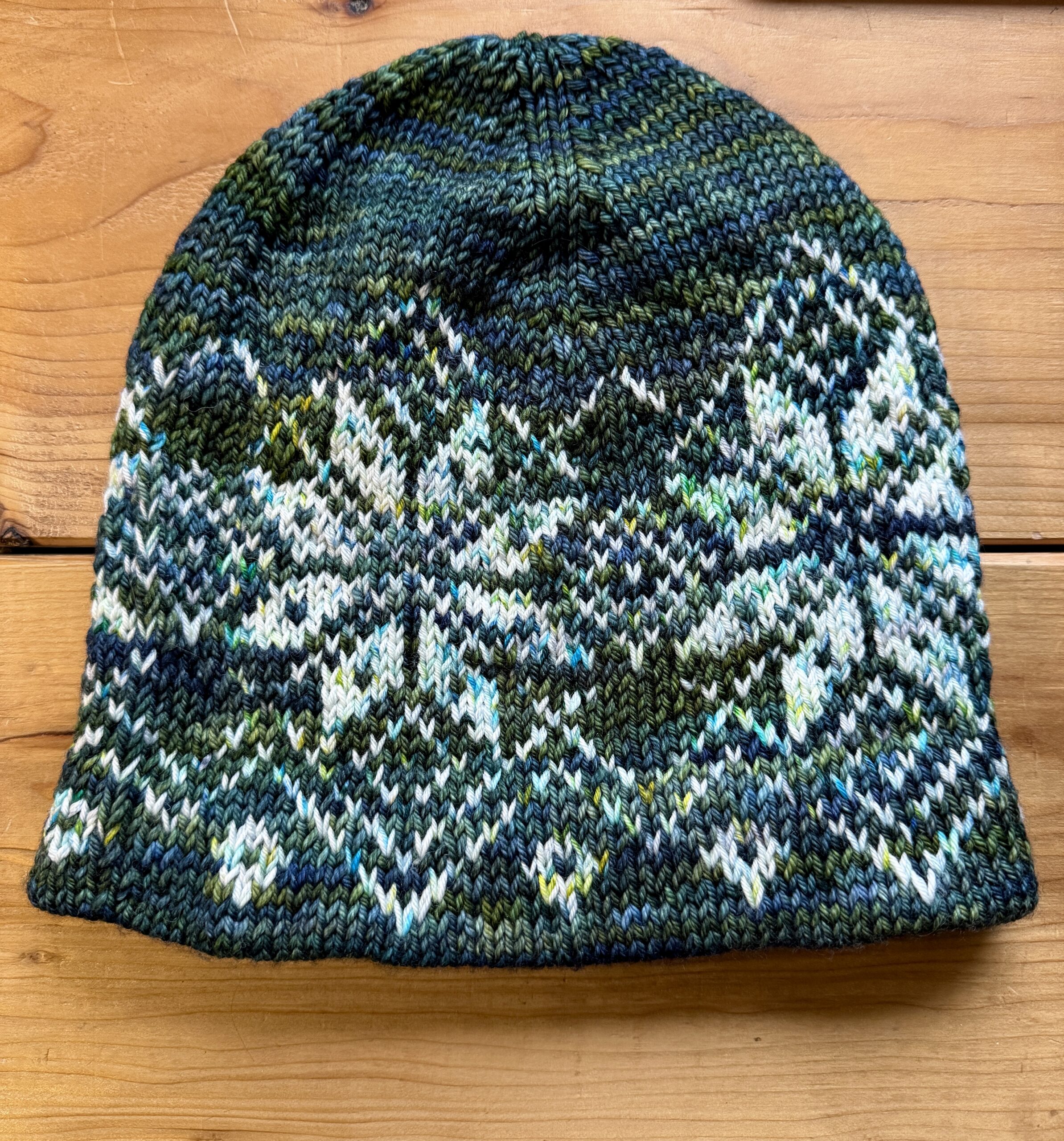 This beanie features a classic snowflake motif. The design draws inspiration from traditional Norwegian mitten patterns, and the name viti comes from an old Finnish word meaning freshly fallen, powdery snow. A little nod to my family heritage and the soft hush of new snowfall.
