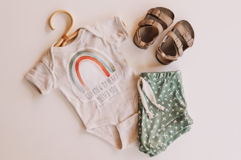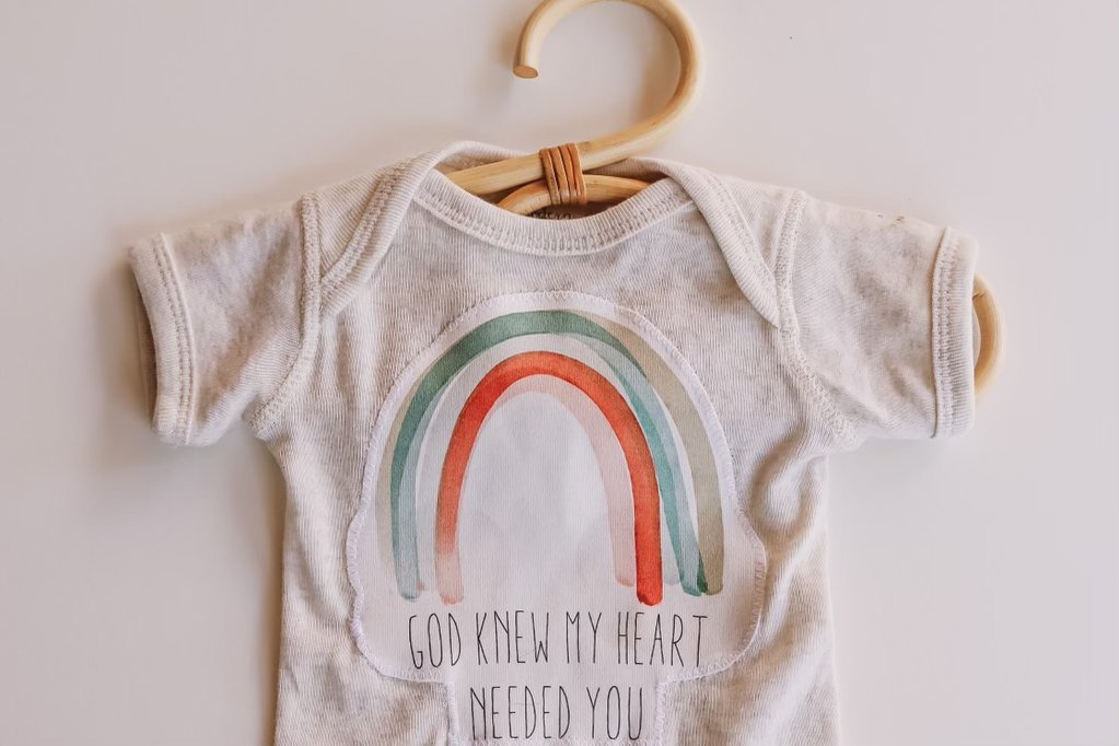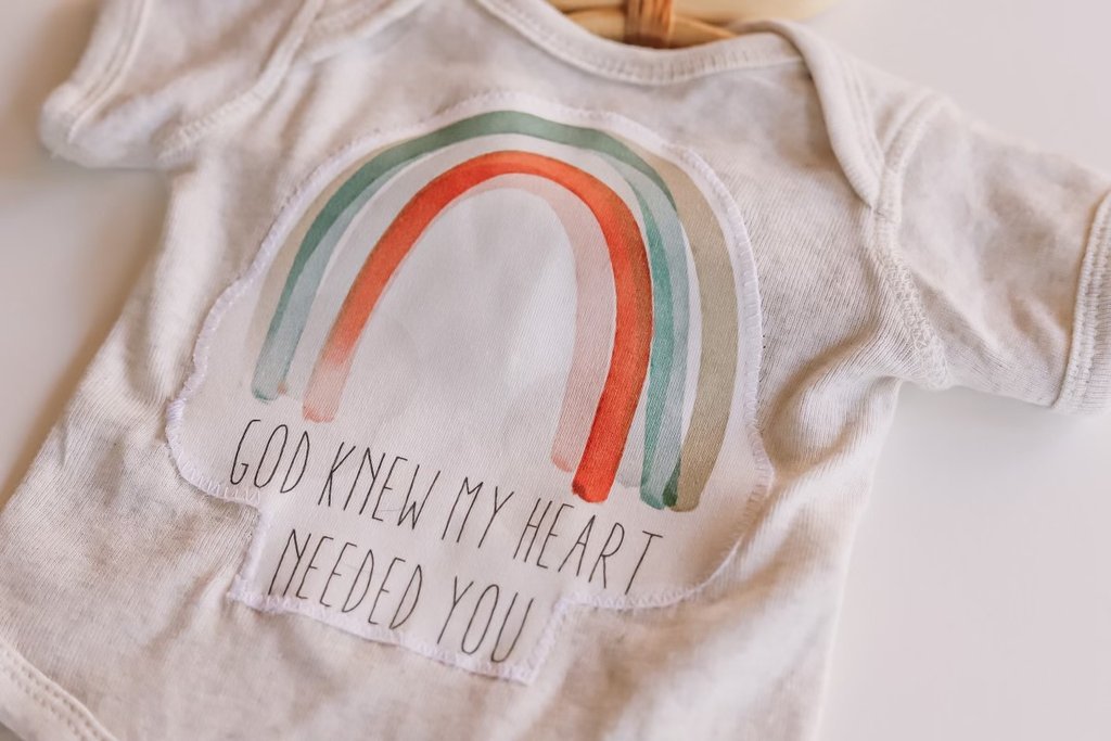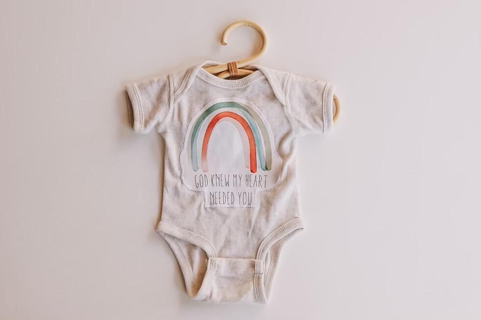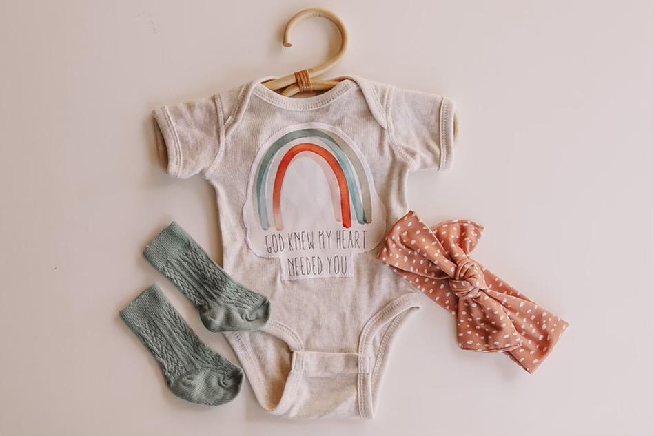 Soft “stone” colored onesie with the perfect message for your most perfect babe. “God Knew My Heart Needed You” appliqué is soft and hand sewn onto the onesie.