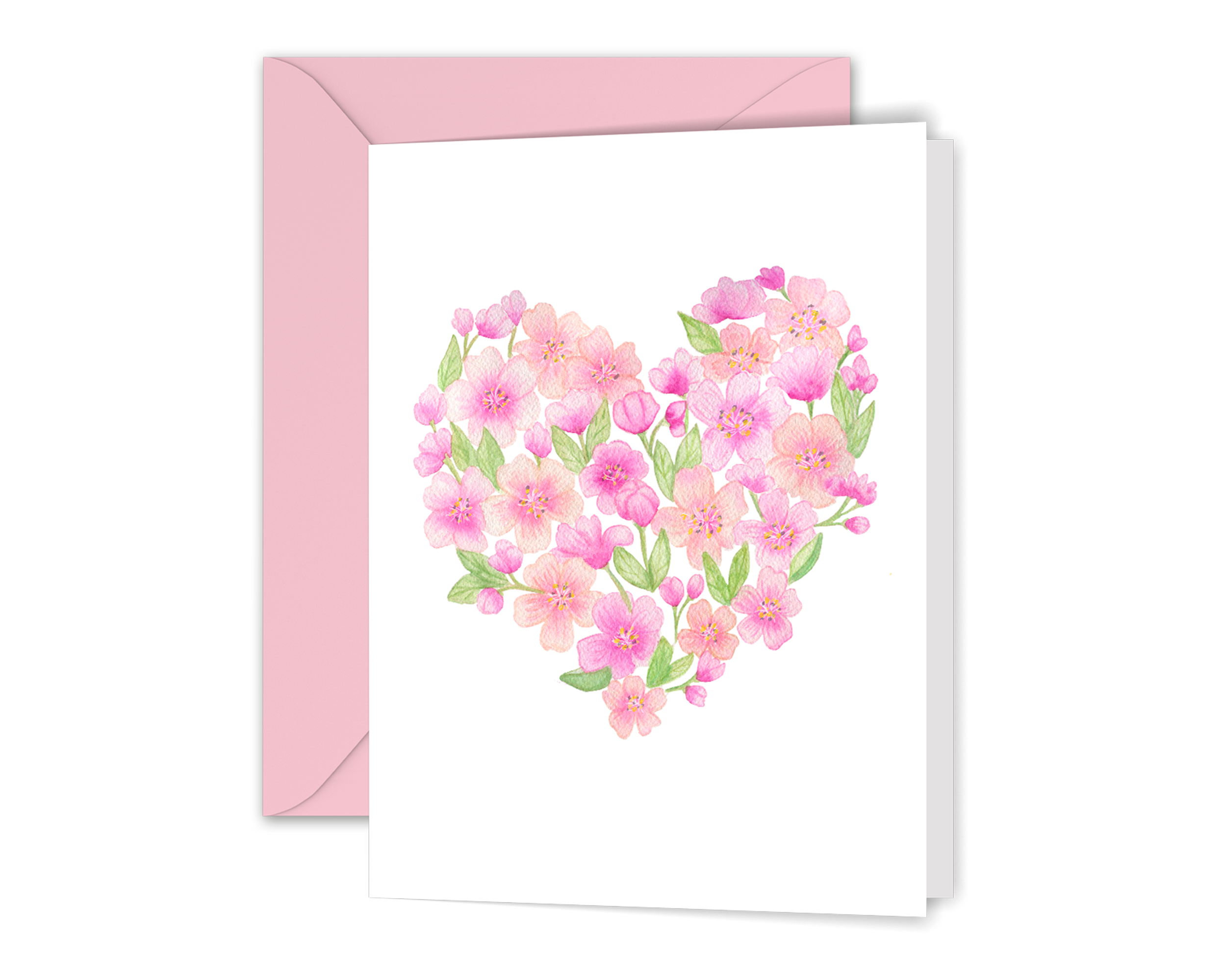 Our card features our watercolor painting of pretty pink cherry blossoms and bright green leaves arranged in a the shape of a heart. The inside of the card is blank with plenty of room for a personal love poem or letter.
