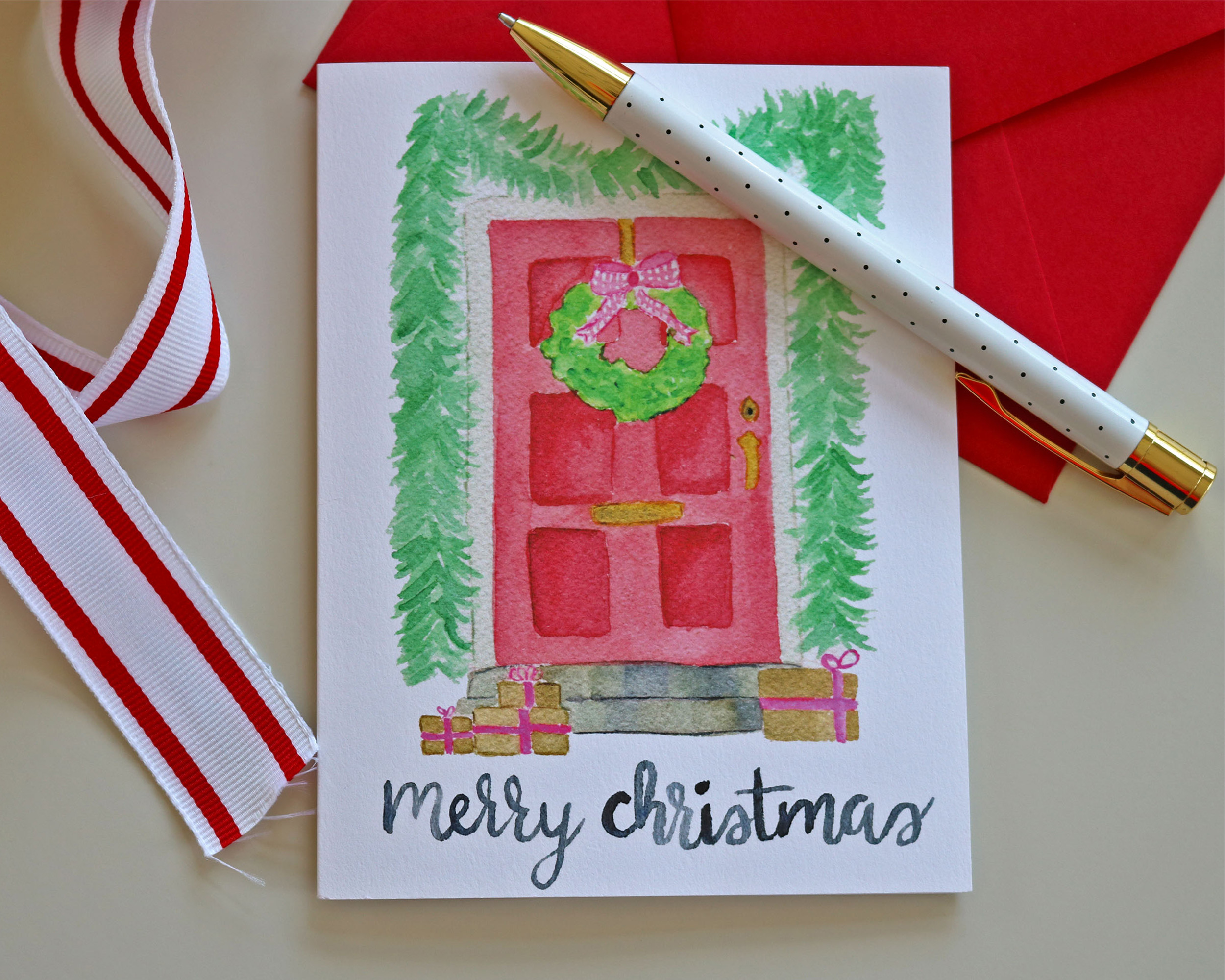 Our cards feature our watercolor painting of a festively decorated front door. We’re obsessed with the tiny packages and their little pink bows and that cute wreath on the door. We also lined the envelope with a pattern of watercolor wreaths and bows.