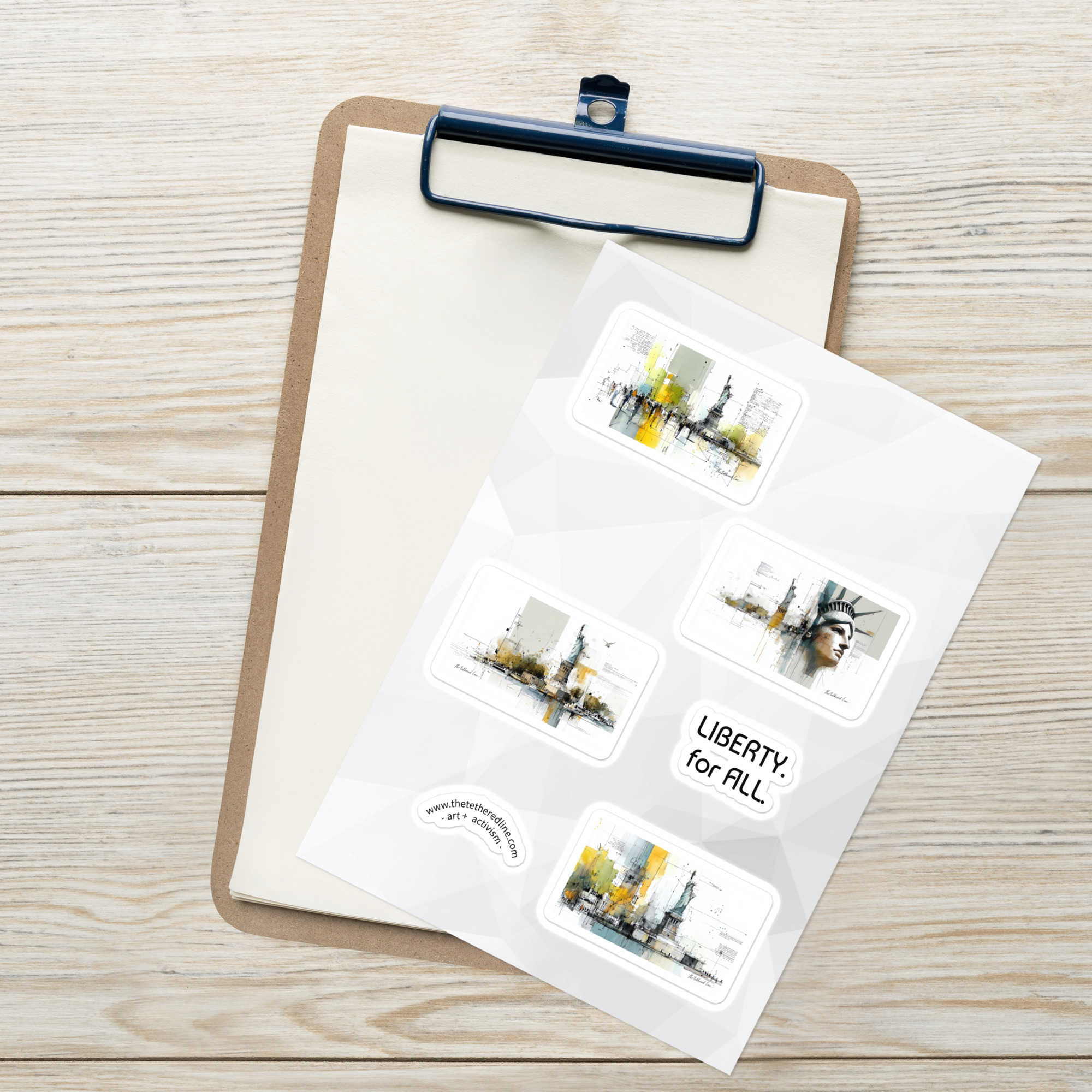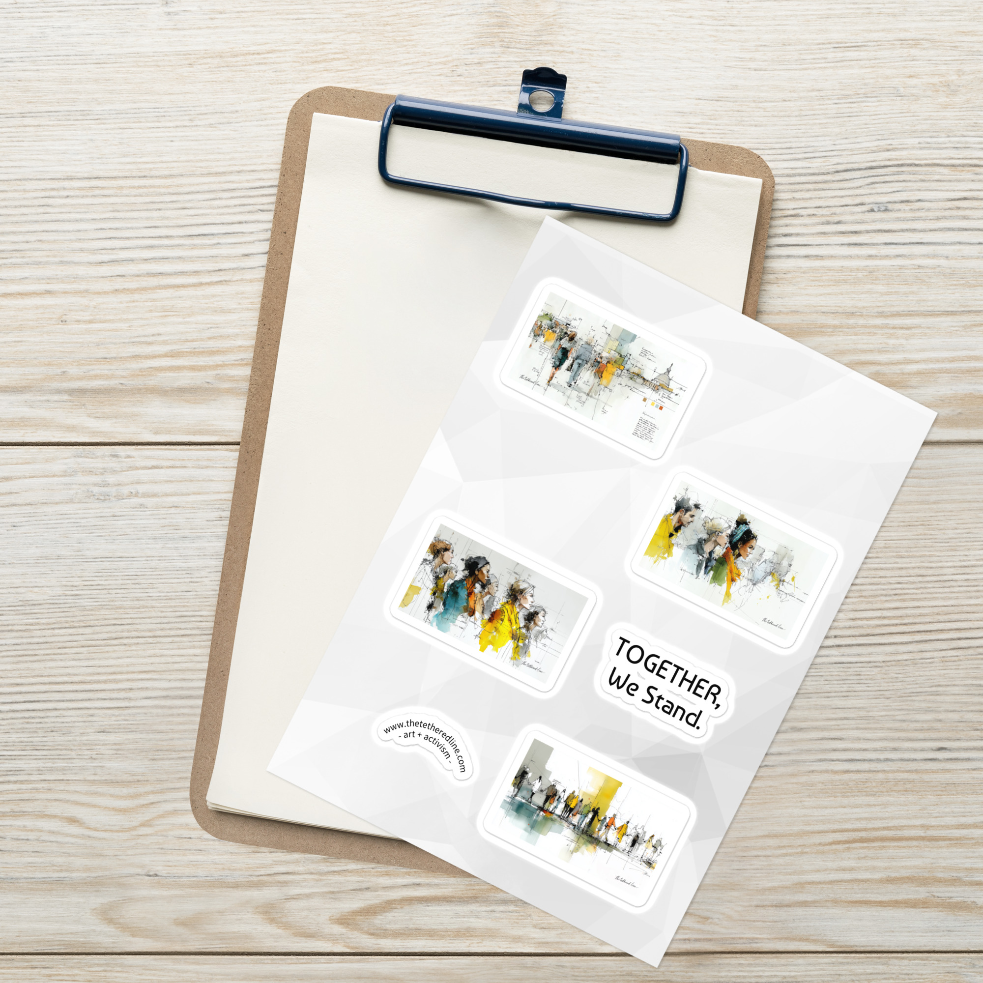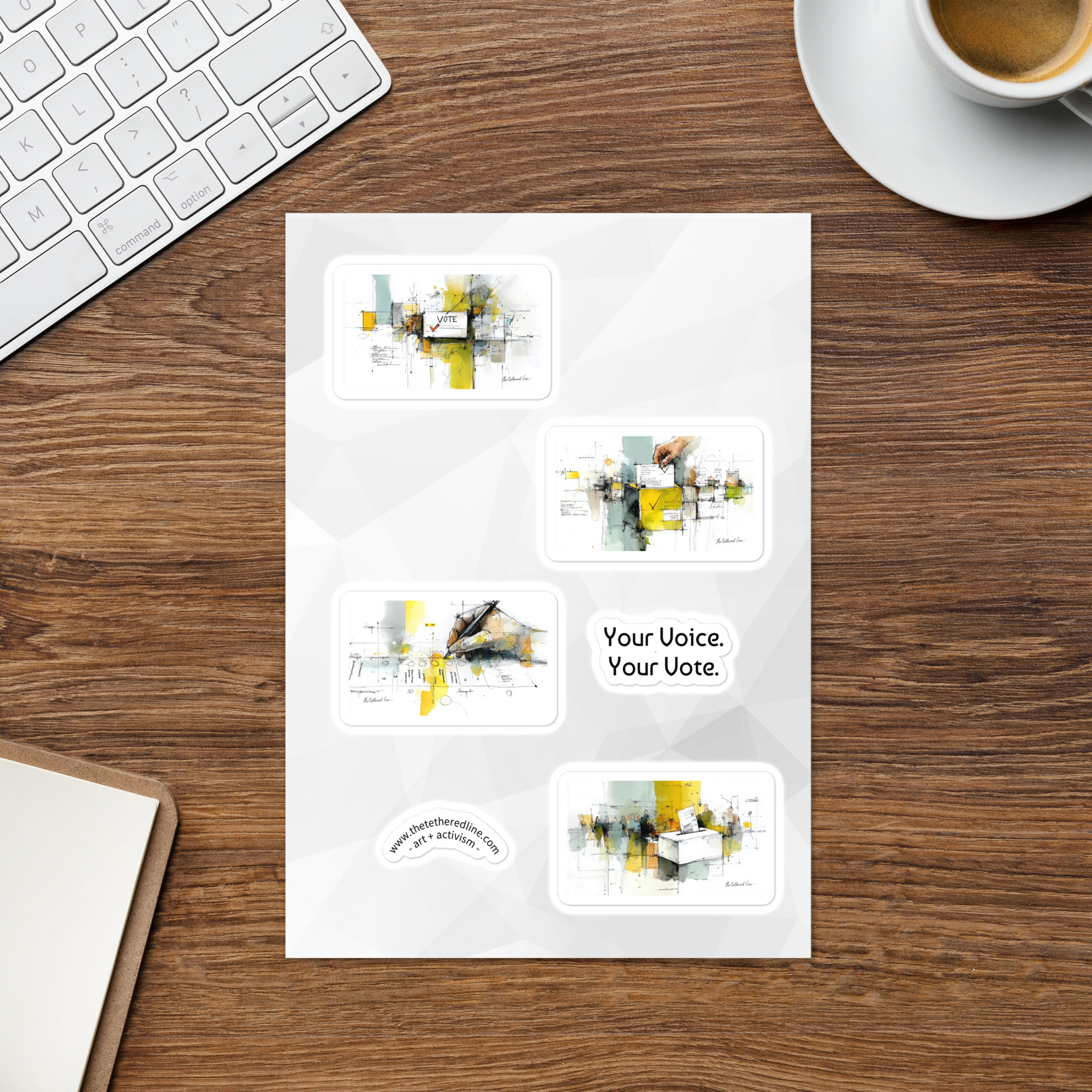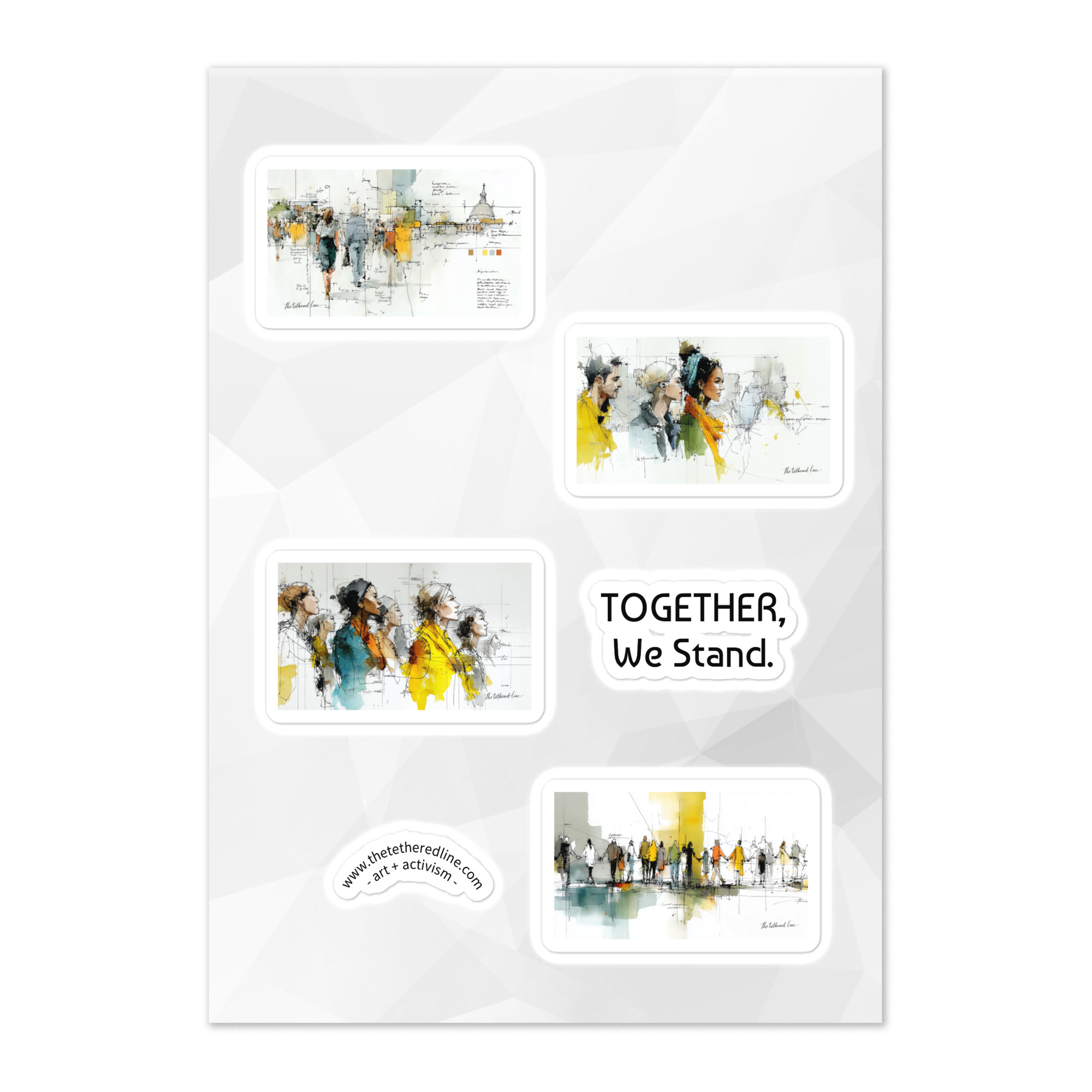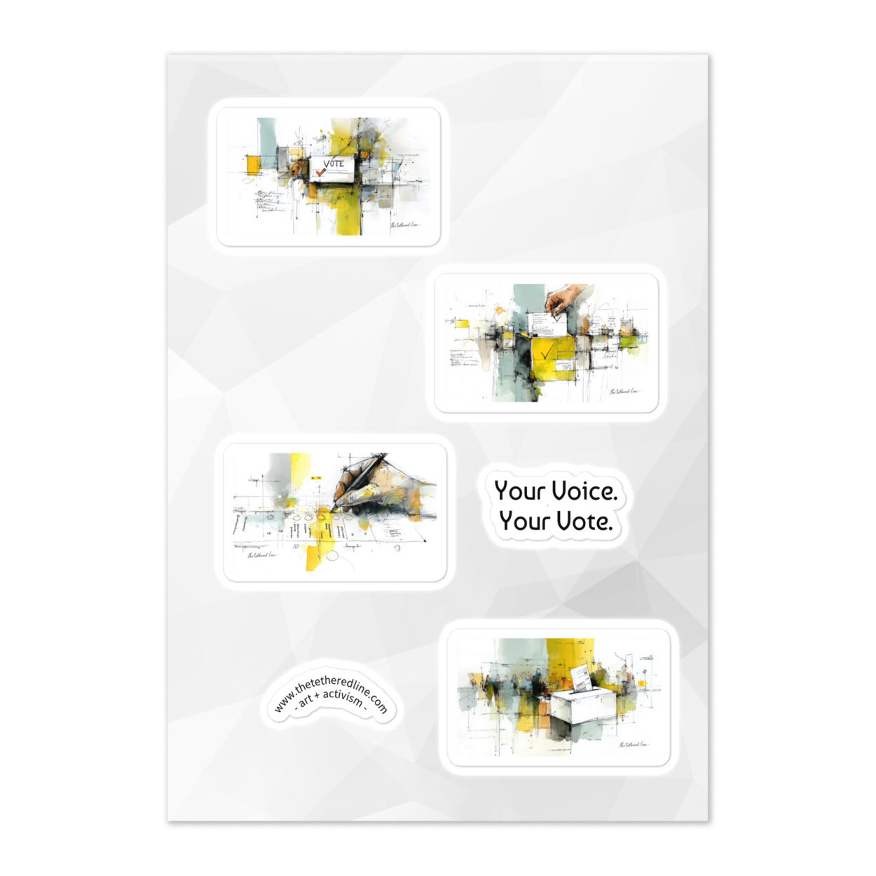 Bring the full We The People collection to life with this special bundle of all three sticker sheets. Each sheet features four original artworks — Your Voice, Your Vote, Liberty For All, and Together, We Stand — plus a bonus “art + activism” arc sticker on every sheet. That’s 12 designs total, created to inspire, connect, and remind us of the power of democracy in action.