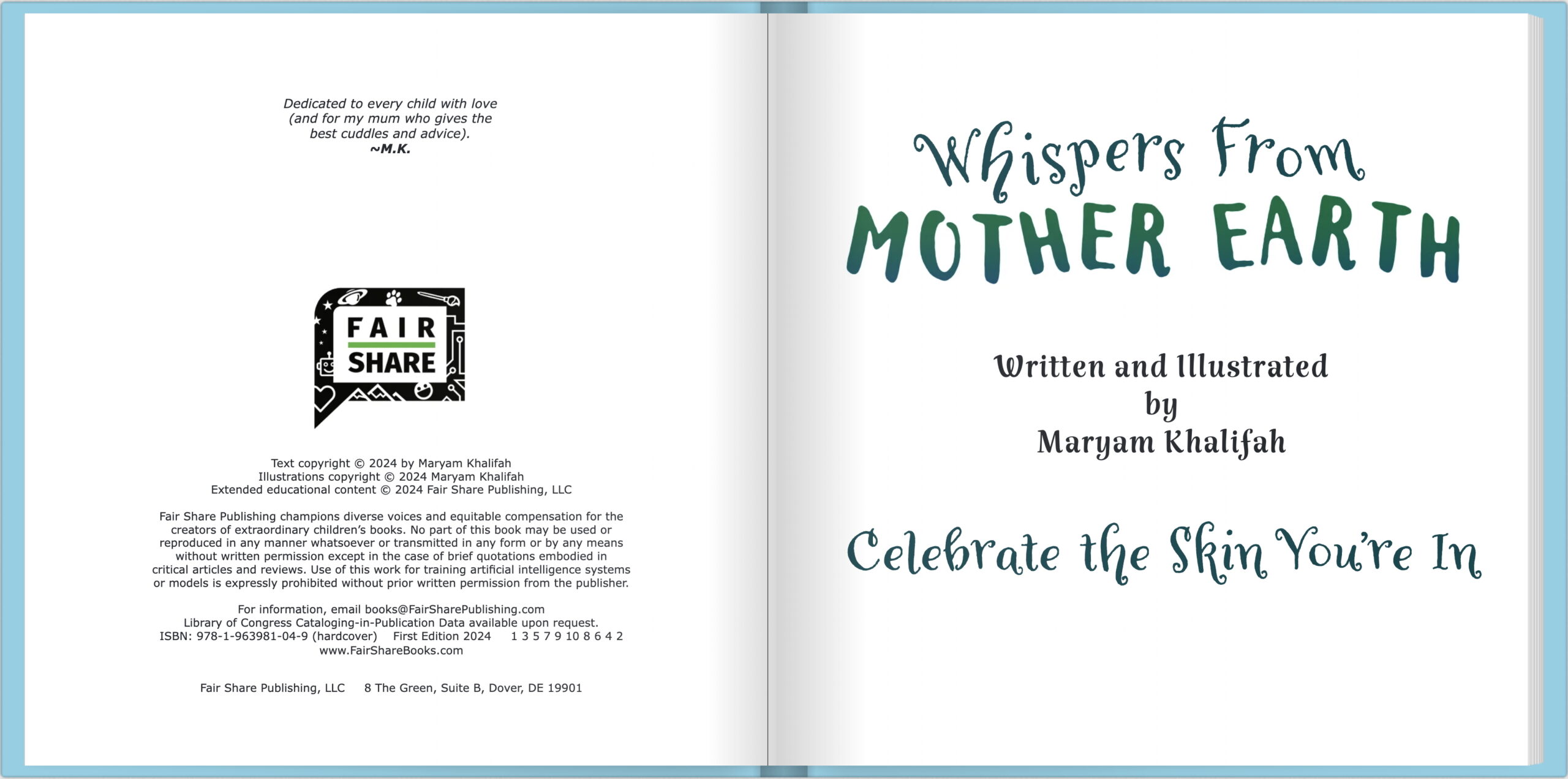 In “Whispers From Mother Earth; Celebrate the Skin You’re In,” gentle letters from Mother Earth remind children that their skin – no matter the color, tint, or tone – is a beautiful reflection of the world’s natural wonders. This debut picture book by Maryam Khalifah encourages children to embrace their individuality, drawing parallels between the beauty of nature and their own unique identities.