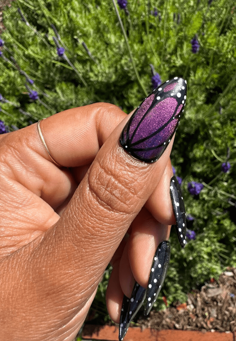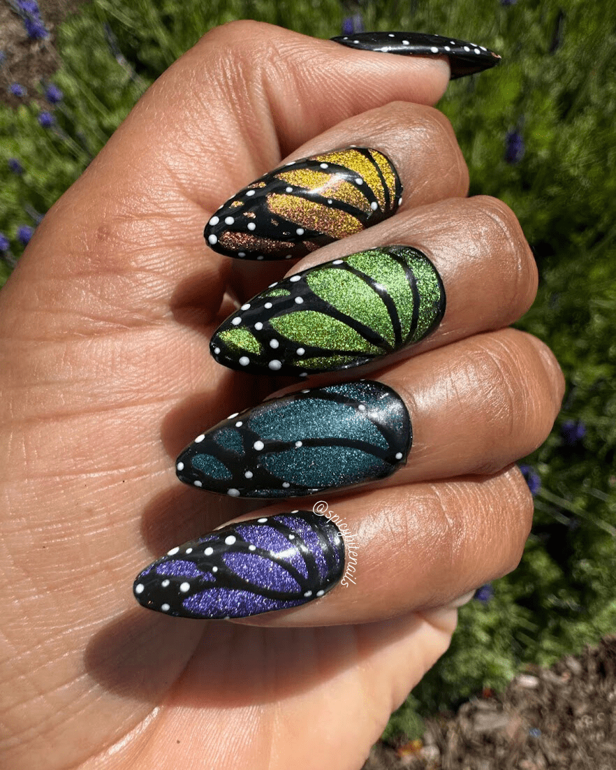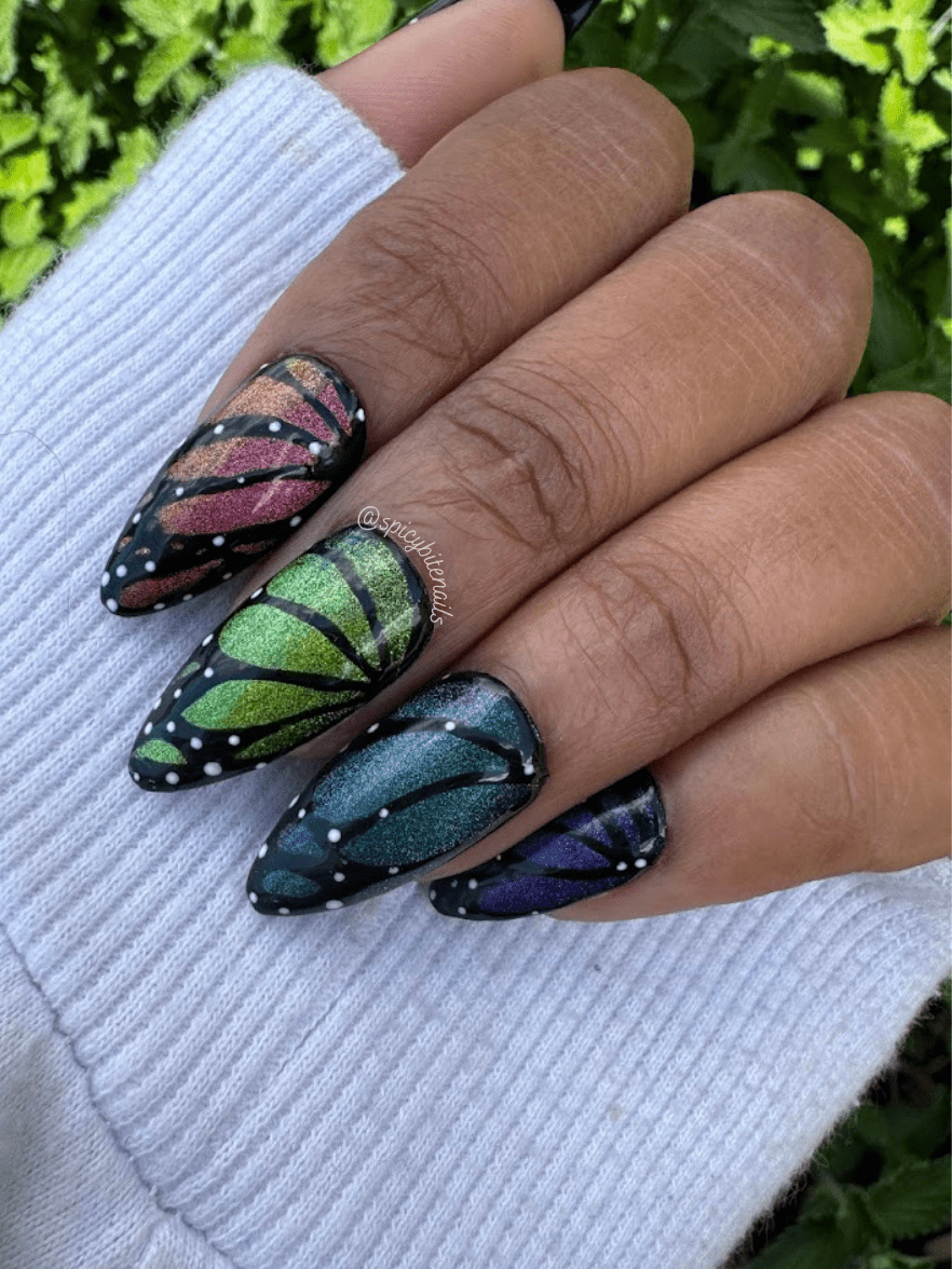 Rainbow color shifting butterfly nails are the perfect way to celebrate the return of the sun for spring. 5 different shades of color shifting cat-eye polish make these nails mesmerizing, especially in the sunlight.