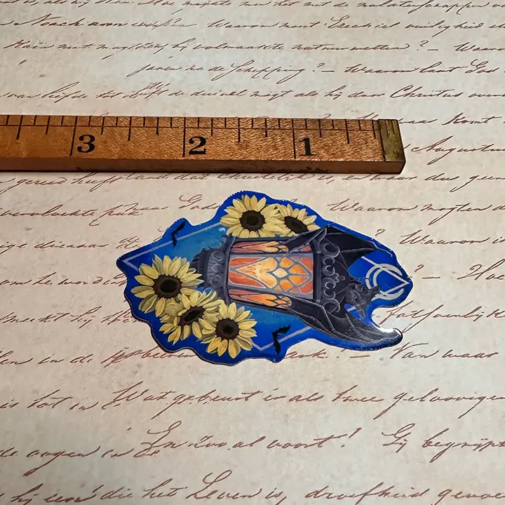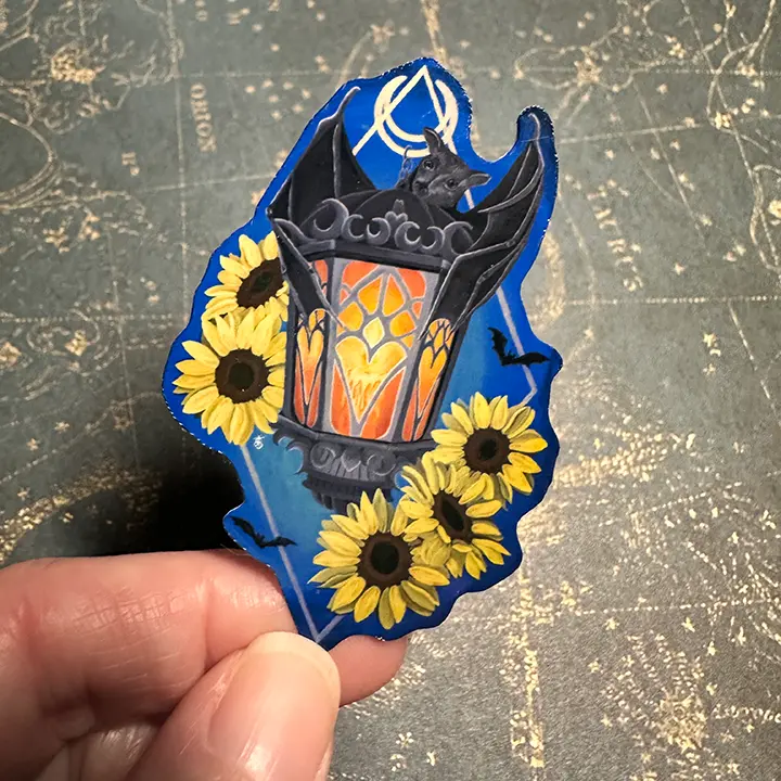 A cute flying fox sitting on top of a celestial lantern surrounded by sunflowers. This was originally a custom commission painting, now offered to you in tiny sticker form. This sticker is just under 2.5 inches tall, but if you would like a different size feel free to reach out to me using the “custom request” option.