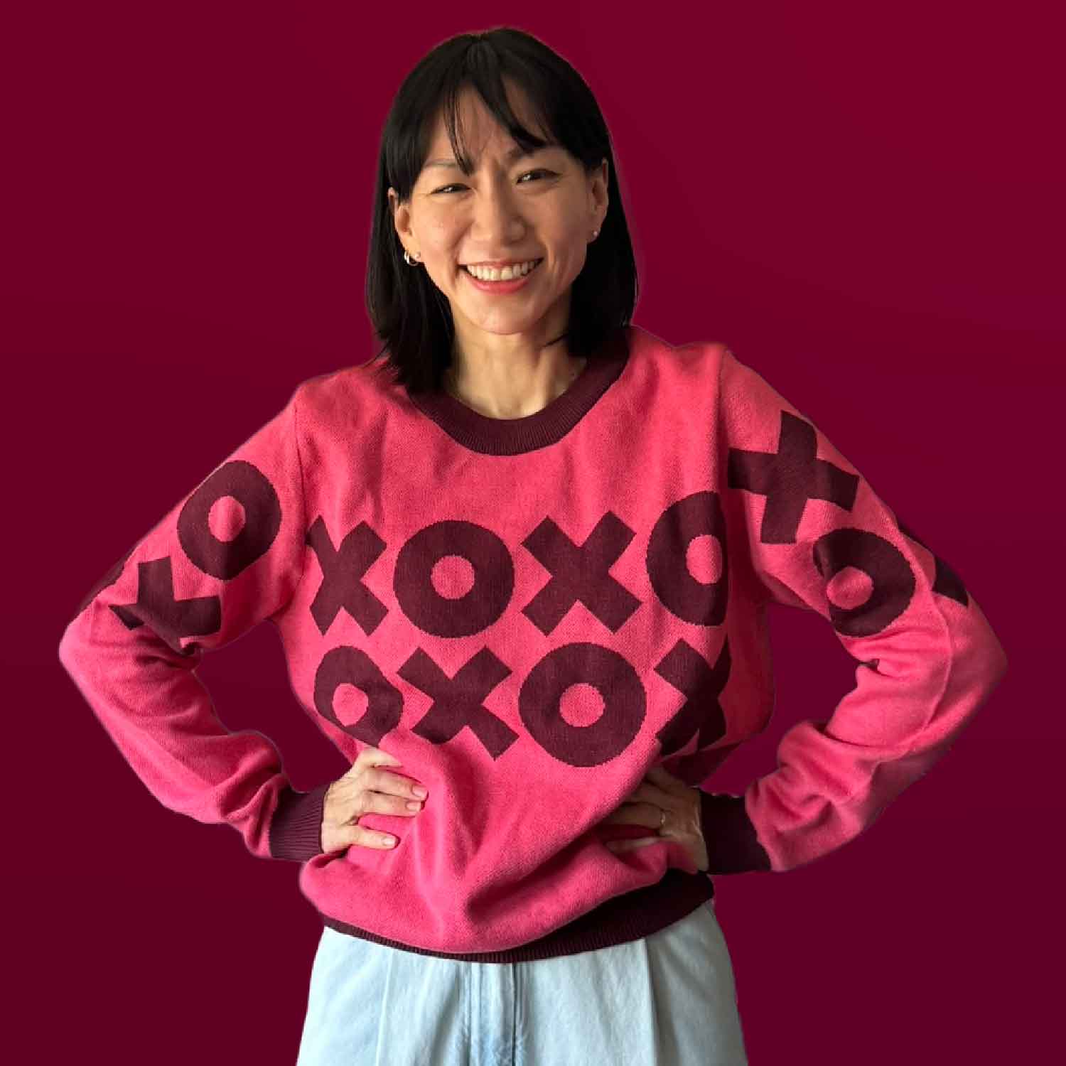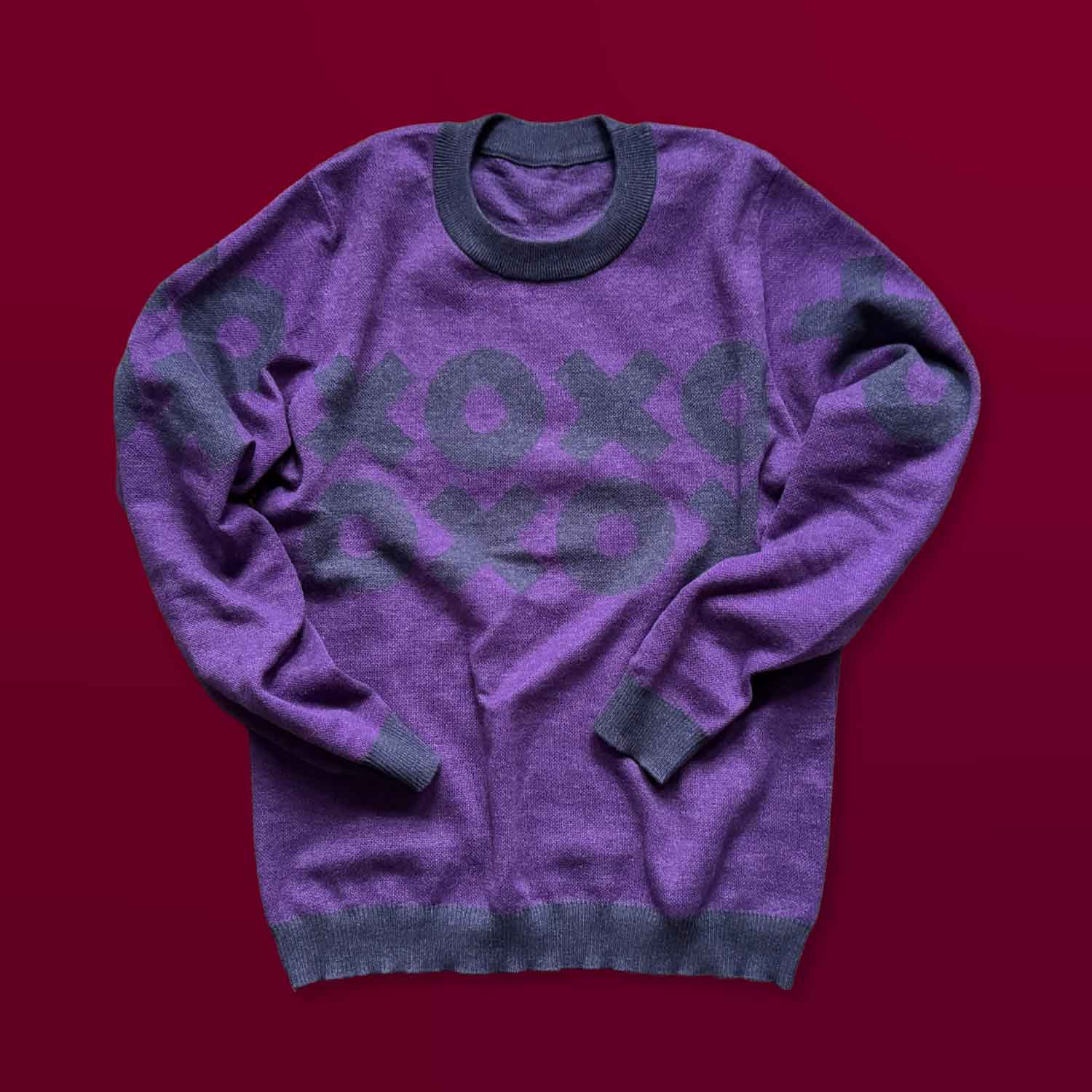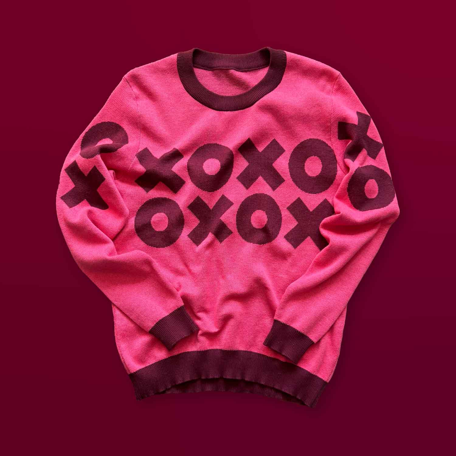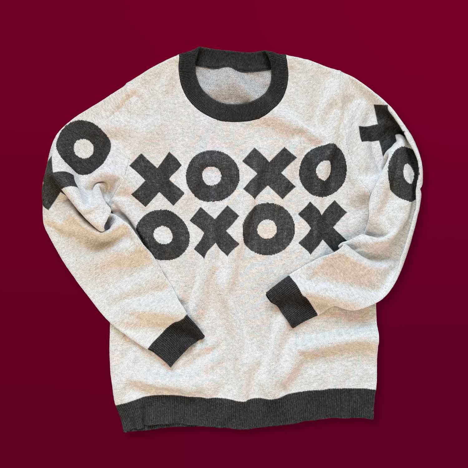 Sign off for the day with all the love. This sweater wraps the X’s and O’s all around the front and back for a full circle design.