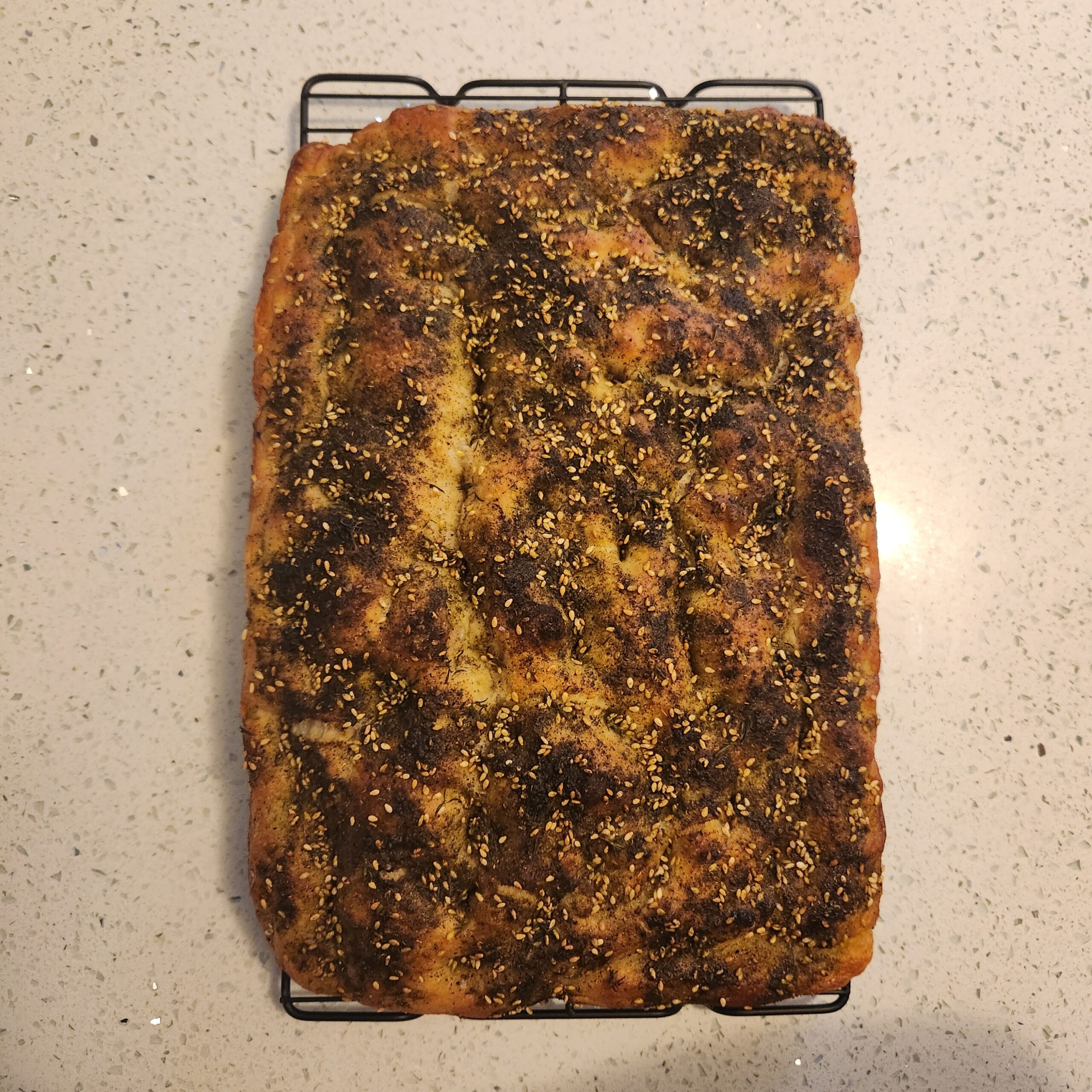 Homemade focaccia bread with fresh sesame thyme zaatar incorporated into the dough and drizzled with pomegranate molasses on top, inspired by late night eats with my Syrian nana in Aleppo.